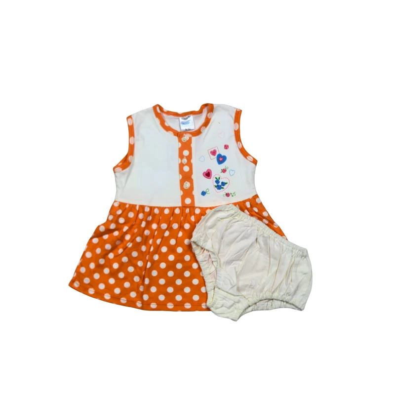 Charming two-piece baby dress set featuring a sleeveless blue dress with white polka dots and a coordinating ivory bodice with colorful flower embroidery. Includes soft elastic bloomers for a comfy, snug fit. Made from breathable, gentle-on-skin fabric perfect for daily wear, dress-up, and special occasions. Suitable for ages 0–24 months. Easy to care for—machine washable.