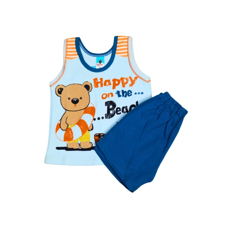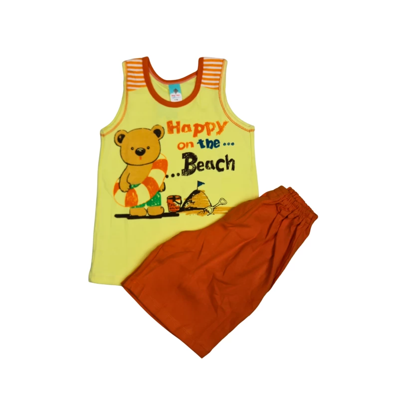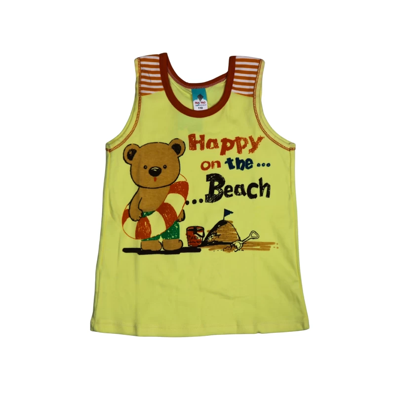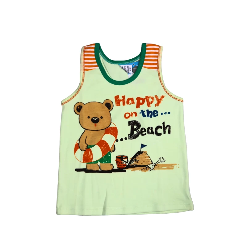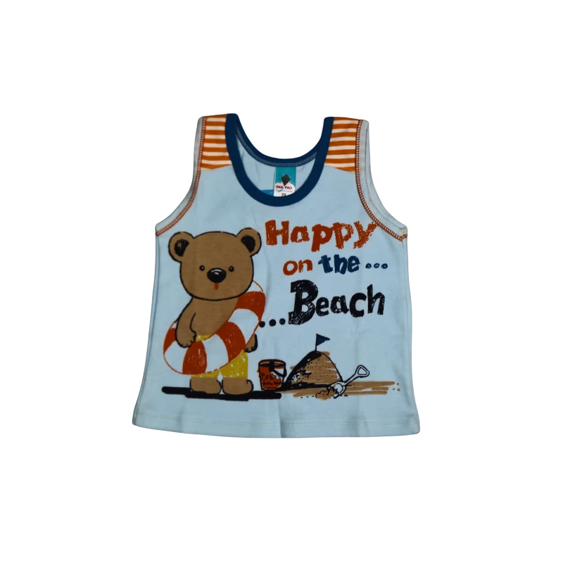 • A sleeveless tank top featuring a cheerful bear and a “Happy on the Beach” graphic with bright, summery colors.