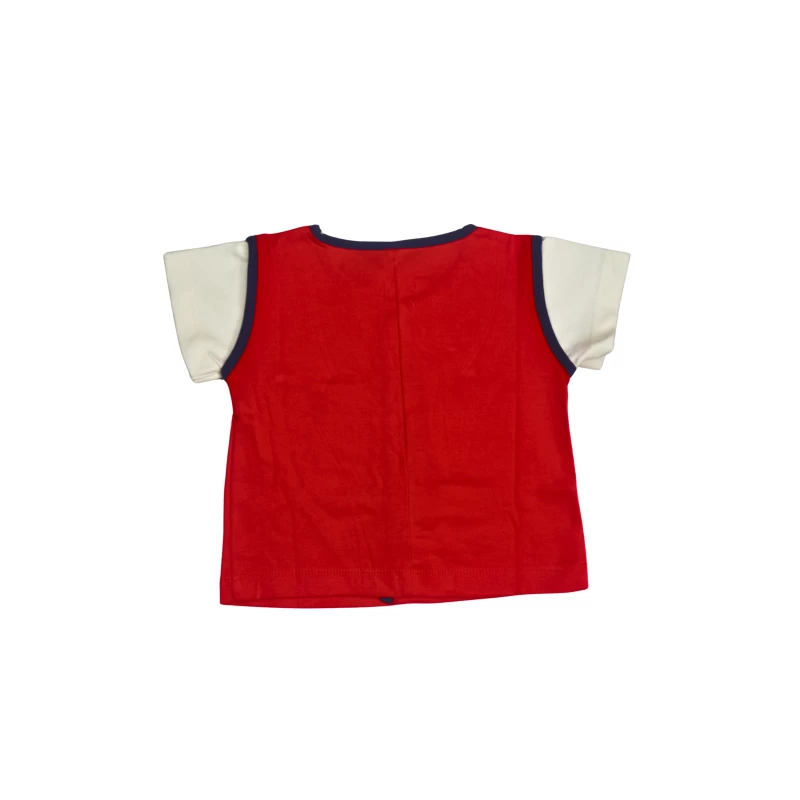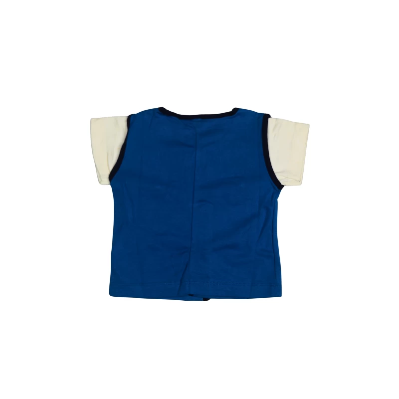 • A short-sleeve top in a rich navy blue with cream sleeves and a cute bear graphic.