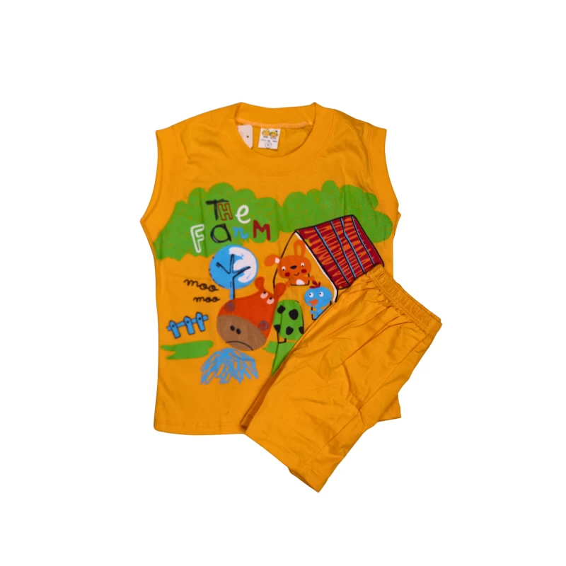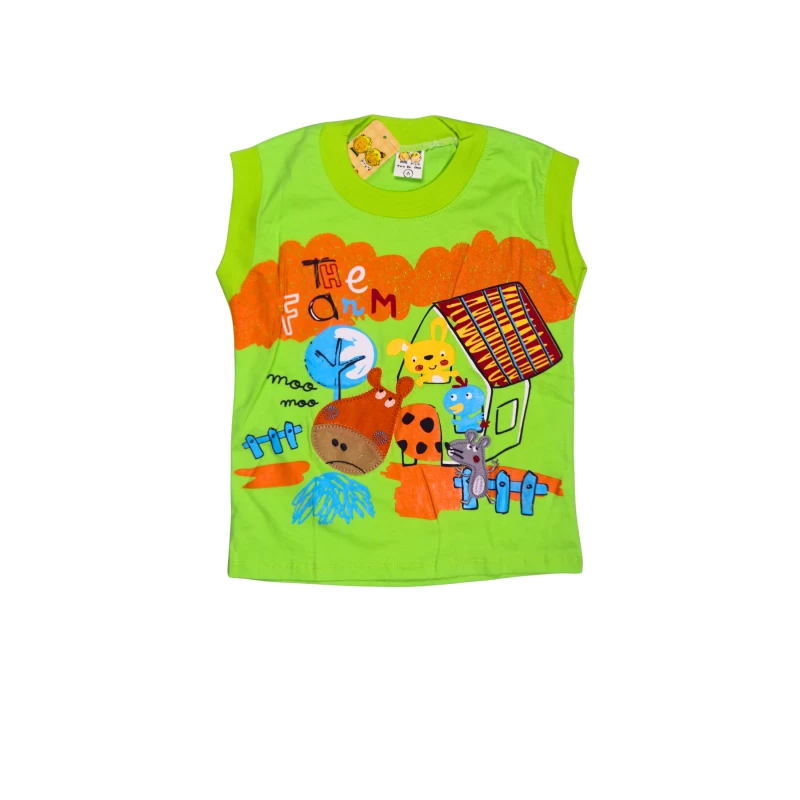 Vibrant lime-green two-piece set featuring a fun animal-themed graphic tee and matching elastic-waist shorts. The tee showcases bold, colorful farm-animal artwork and playful typography, perfect for lively summer days and everyday adventures. Made from soft, breathable fabric for all-day comfort.