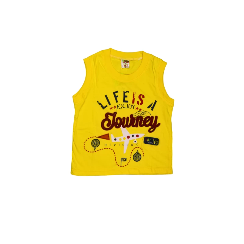 Brighten playtime with this sunny yellow two-piece set: a sleeveless tank top and matching shorts. Made for comfort and movement, the soft, breathable fabric keeps kids cool during sunny days and active adventures. The bold graphic print features the playful slogan “Life is a Journey,” along with fun design elements that kids love. The elastic waistband on the shorts provides a secure, easy fit for growing kids. Durable stitching ensures this set stands up to everyday wear and washing.