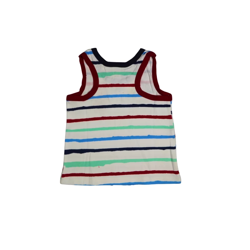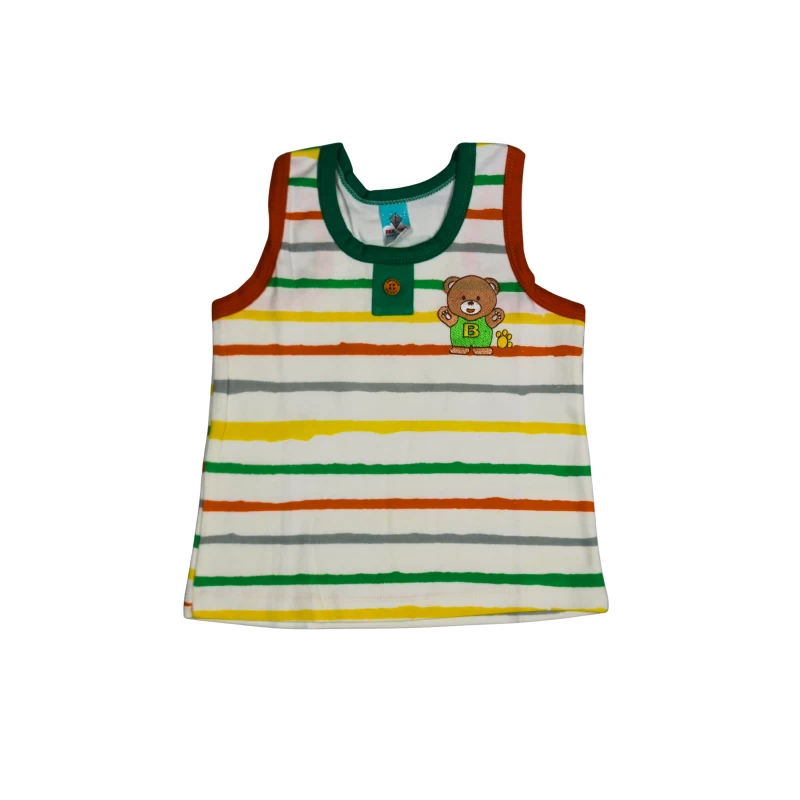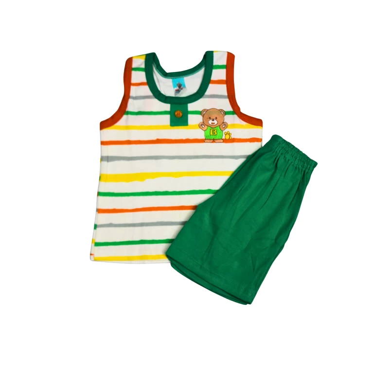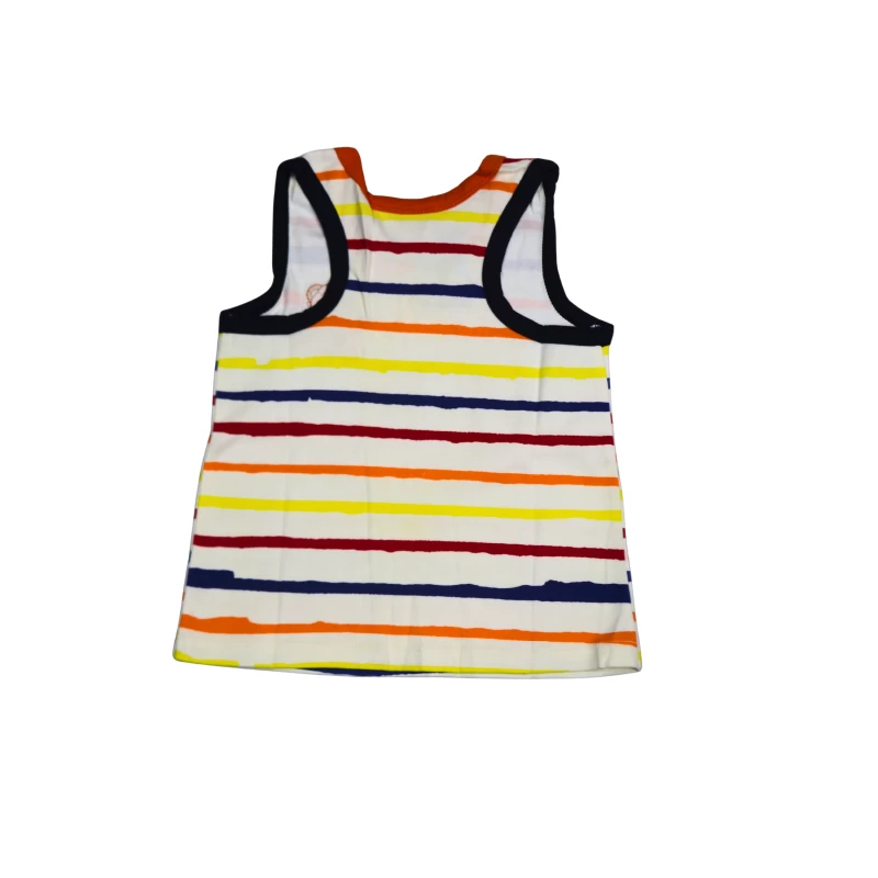 Bright and playful striped sleeveless top paired with vibrant orange shorts. The top features bold horizontal stripes in multiple colors, a contrasting orange neckline, and cute bear embroidery for added charm. Elastic waistband on the shorts ensures a comfy, easy fit for active kids. Made from soft, breathable fabric, this set is perfect for summer play, outdoor adventures, and casual outings. Available in multiple kids’ sizes. Easy to care for—machine washable.