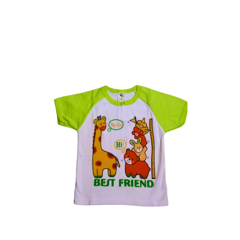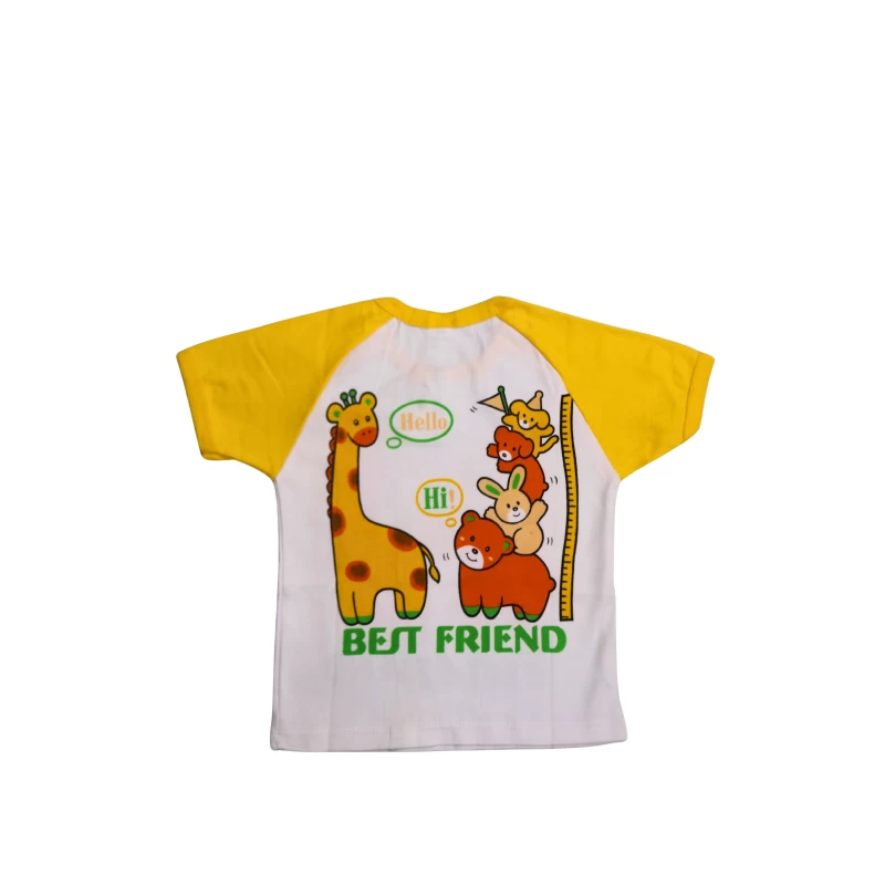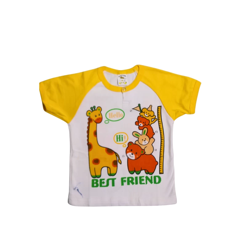 Cheerful two-piece pajama set for kids featuring a bright yellow short-sleeve tee and matching shorts. The front of the tee showcases a playful jungle scene with a giraffe and friendly animal friends, plus fun speech bubbles like “Hello” and “Hi.” The breathable fabric and comfy elastic waistband on the shorts make this set perfect for bedtime, lounging, or warm-weather nights. Vibrant print designed to spark imagination and joy. Available in multiple kids’ sizes.