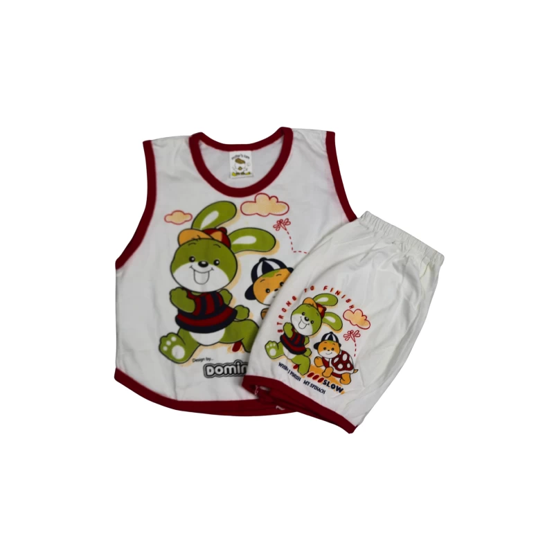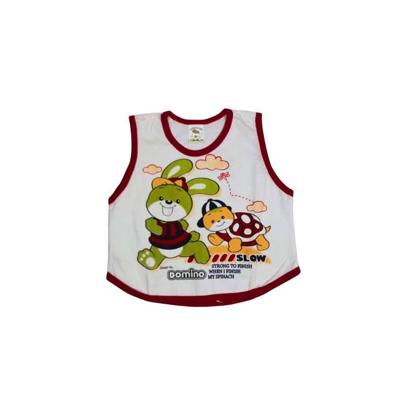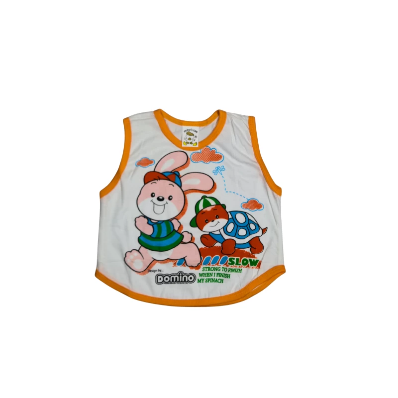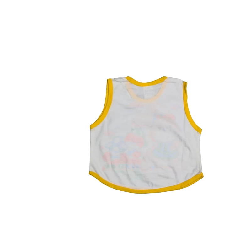 • A sleeveless tank top with white body, orange trim, and a playful bunny graphic.