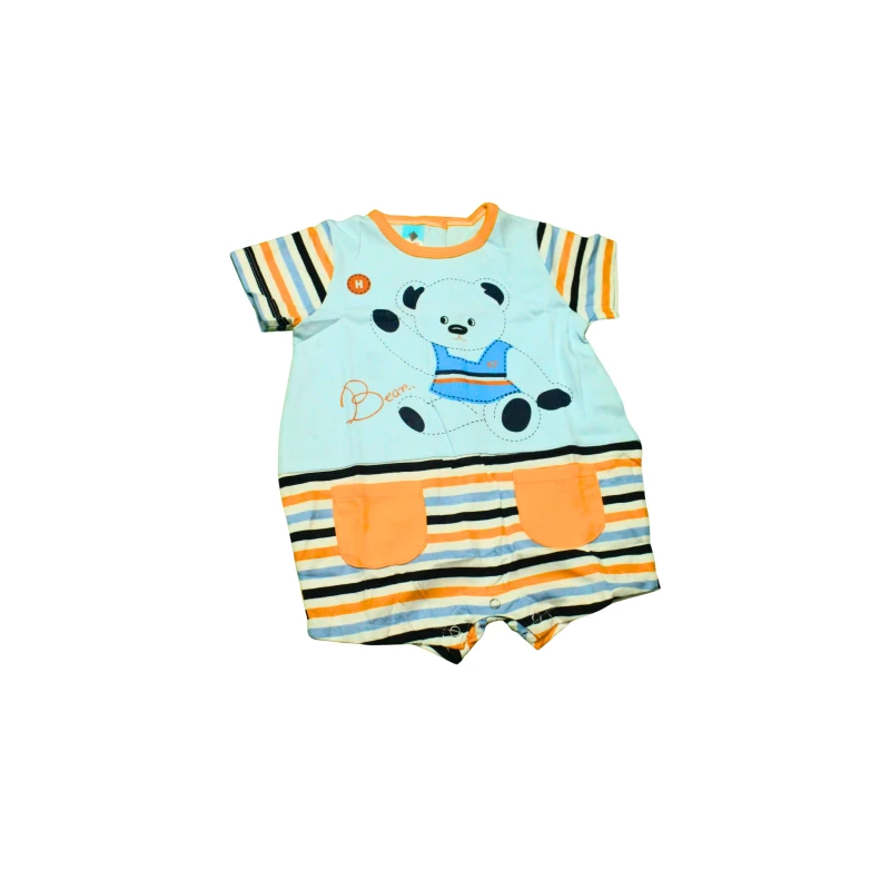 Bright and adorable romper for sunny days and playful adventures. This light-blue romper features a cute bear print on the chest, navy striped sleeves, and contrasting navy pockets. The muted pastel tones keep it sweet and easy to mix-and-match, while the soft, breathable fabric ensures comfort all day. Perfect for everyday wear, playdates, and family outings.