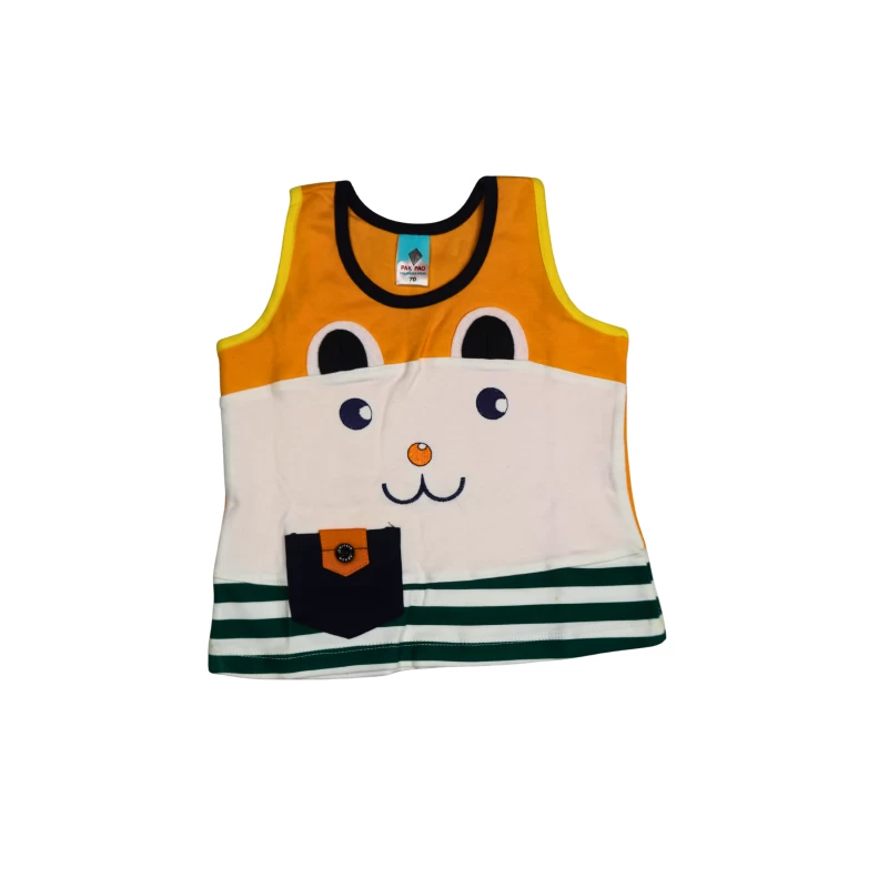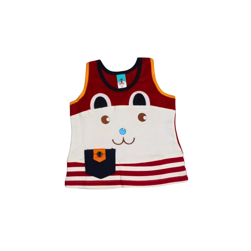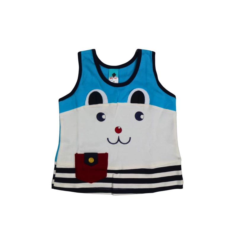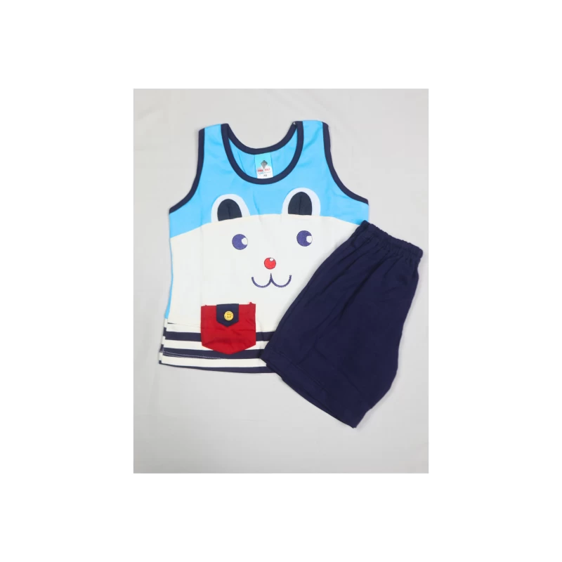 Brighten playtime with this adorable animal-themed sleeveless tank top and navy shorts set. The sleeveless top features a playful blue and white bear face design with a friendly red nose and cute eyes, plus a handy red pocket detail for added charm. The coordinating navy shorts complete the look with comfort-fit elastic waist for easy movement. Made from soft, breathable fabric, this set is perfect for warm days, trips to the park, or casual family outings. Available in multiple sizes for kids aged 1–8 years. Easy care—machine washable.
