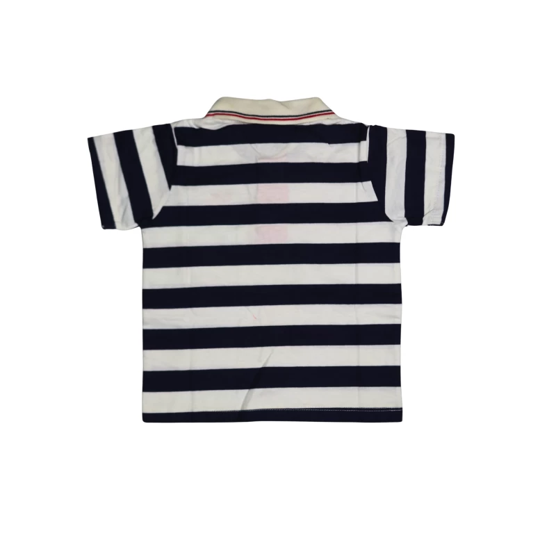 Classic and comfortable summer set for active kids. This polo-style short-sleeve shirt features bold navy and white horizontal stripes, a cream collar with red contrast trim, and red buttons for a polished look. The matching navy shorts complete the outfit with an elastic waistband for easy, all-day wear. Made from soft, breathable fabric ideal for play, school, or family outings. Available in multiple sizes to fit kids from 2 to 8 years. Easy care—machine washable.