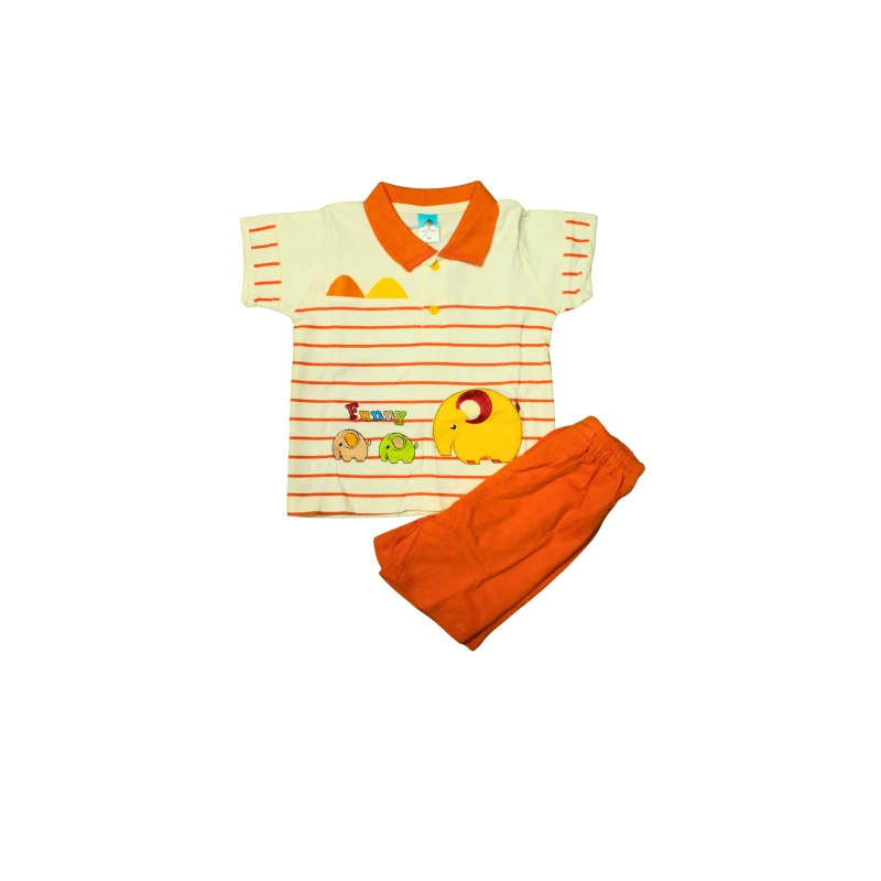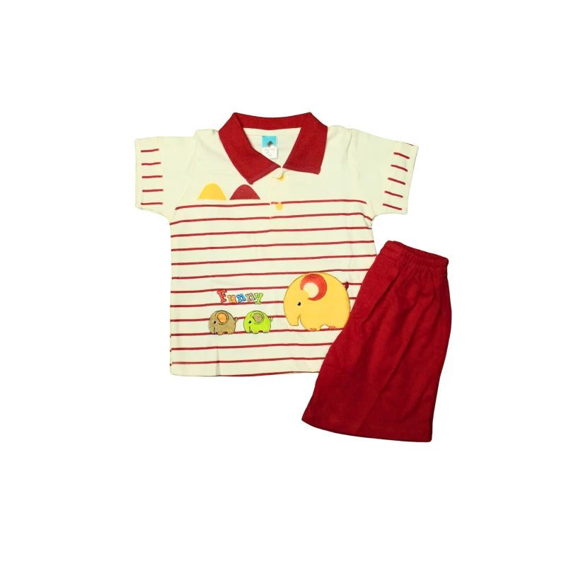 • Cute two-piece outfit for kids featuring a cream polo-style tee with red collar and red stripes, plus matching red shorts. The tee showcases playful animal graphics and colorful accents, making it perfect for daily wear, summer outings, and family events.