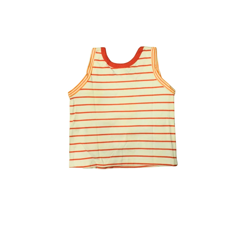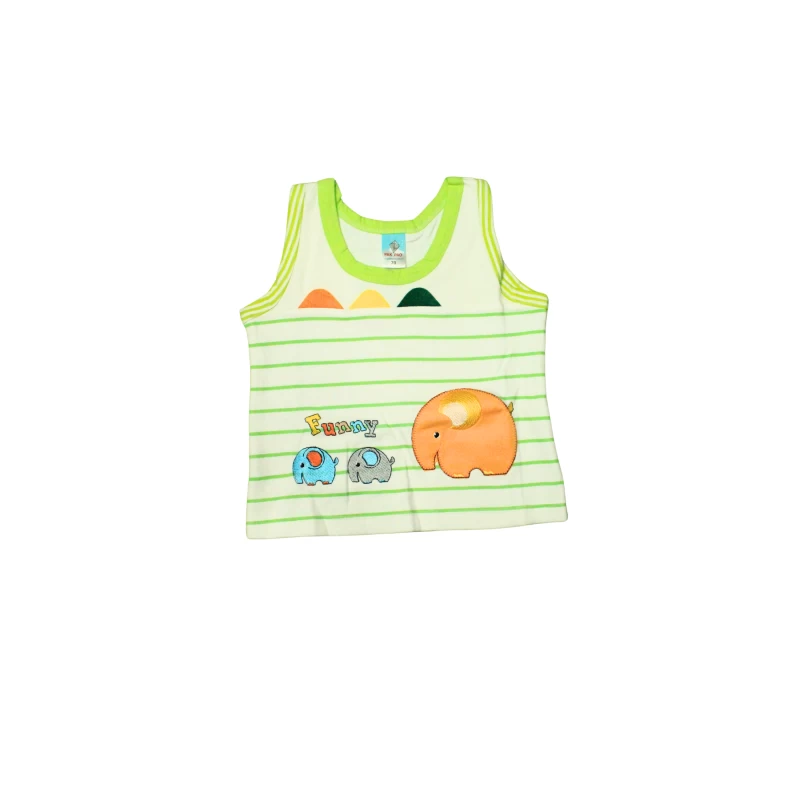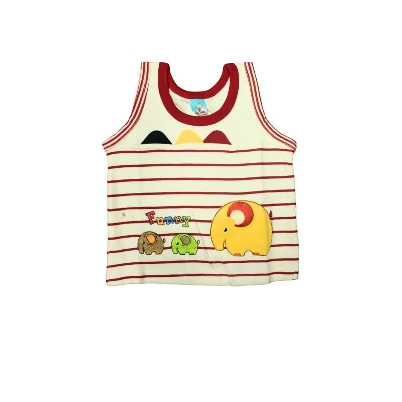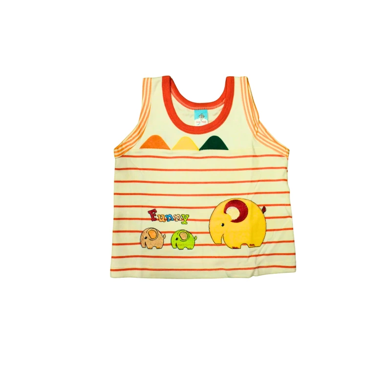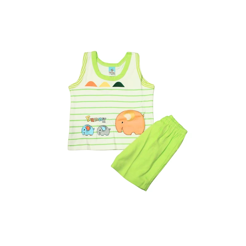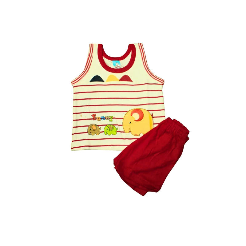 • Fun two-piece outfit for kids featuring a cream tank top with navy stripes, a navy collar trim, and colorful cartoon elephants on the lower front. Paired with comfortable black shorts with an elastic waistband for easy dressing and all-day play.