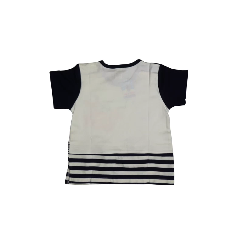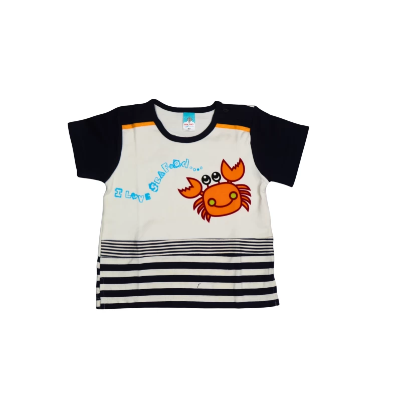 • Bright and playful kids’ set featuring a navy short-sleeve T-shirt and matching navy shorts. The front of the T-shirt showcases a cheerful orange crab graphic with a blue sea-themed phrase, perfect for sunny days at the beach or park. The shirt has navy sleeves with a light body, and the bottom hem features stylish navy and white stripes for a nautical look. Made from comfortable, breathable fabric ideal for active kids.