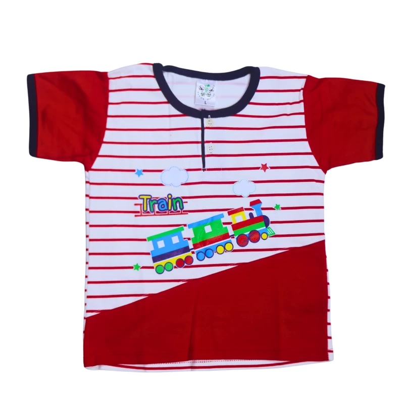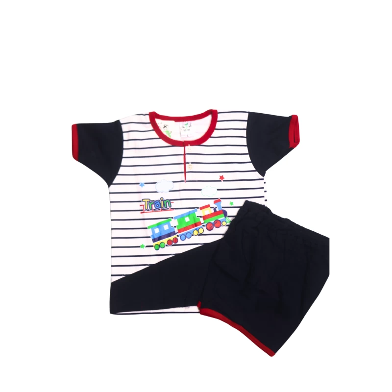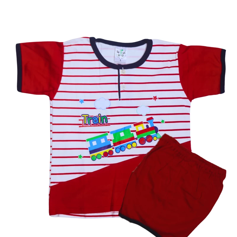 Bright and playful kids’ pajama set featuring a red-and-white striped top with navy trim and a coordinating red pair of shorts. The top showcases a colorful “Train” graphic with a locomotive and clouds, perfect for little engineers. Soft, breathable fabric for comfy sleep and lounging. Easy slip-on design with convenient short sleeves and a front placket. Durable for everyday wear and machine washable.