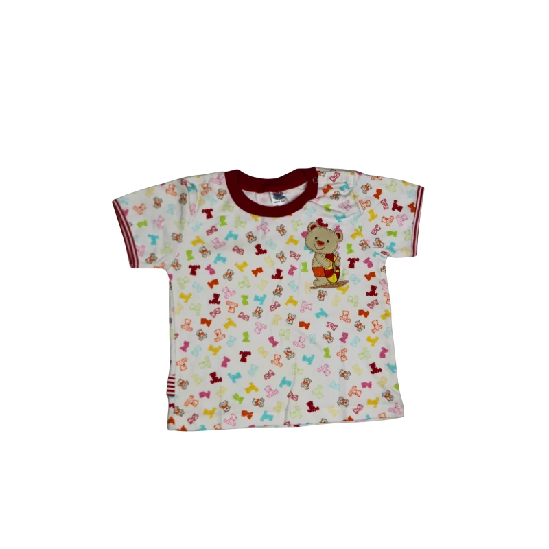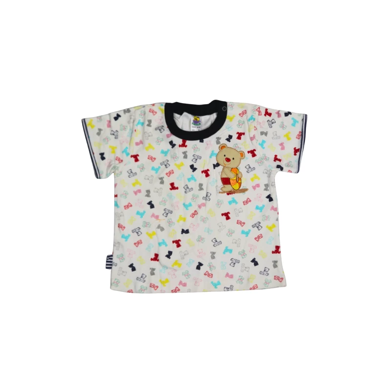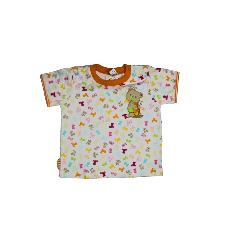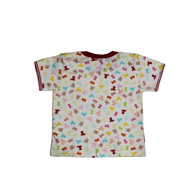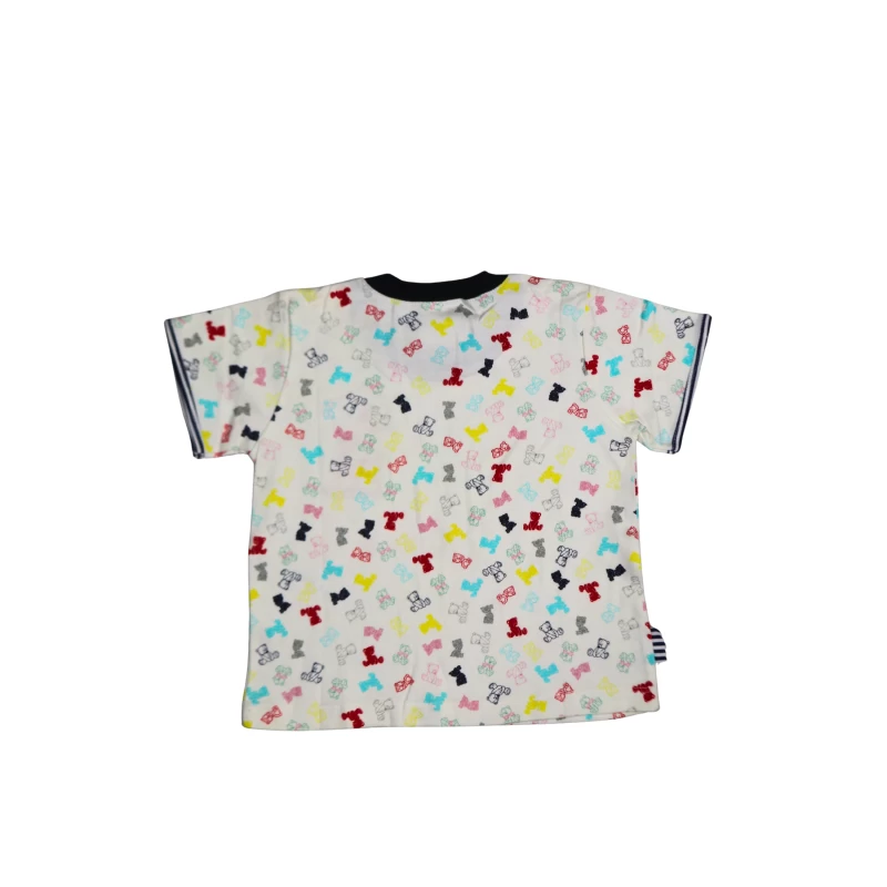 • A short-sleeve T-shirt with a cute bear graphic and a playful, multicolor bow-print pattern.