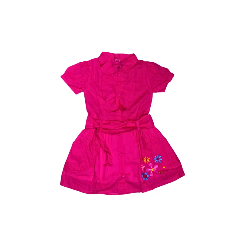 Delightfully girly and comfortable, this Pink Embroidered Floral Dress is perfect for sunny days, parties, and family gatherings. The dress features puff short sleeves, a classic polo-style collar with a ruffle front, a matching fabric belt to cinch the waist, and colorful embroidered flowers on the skirt for a playful splash of color.