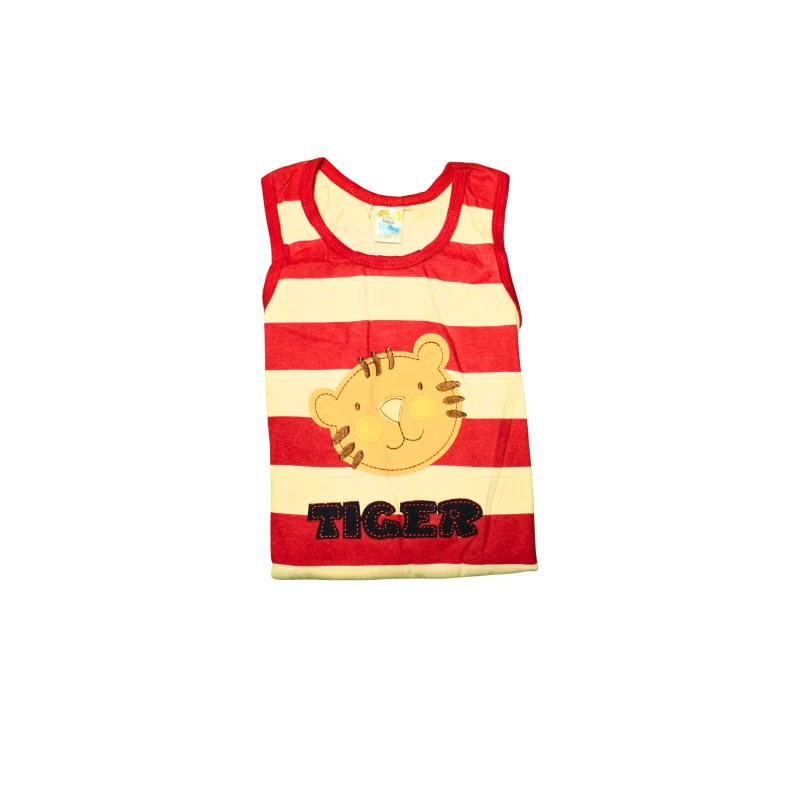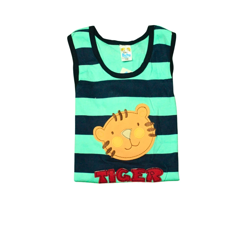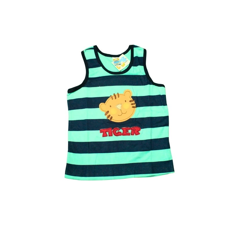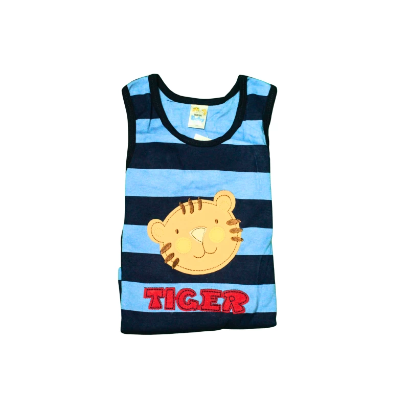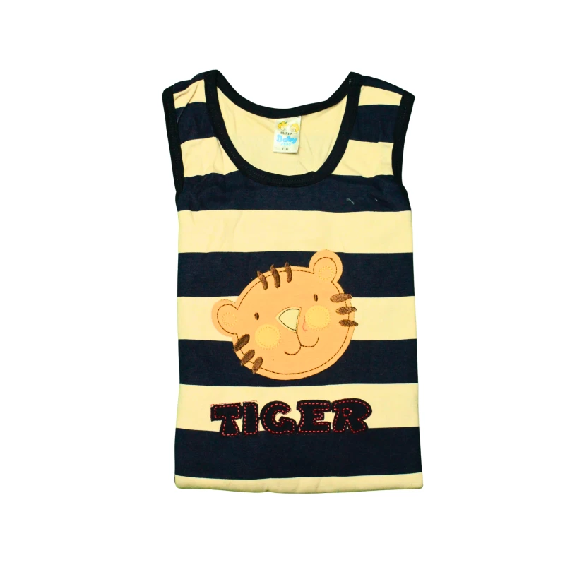• A sleeveless tank top with bold navy and yellow horizontal stripes, navy trim, and a cheerful tiger graphic on the front.