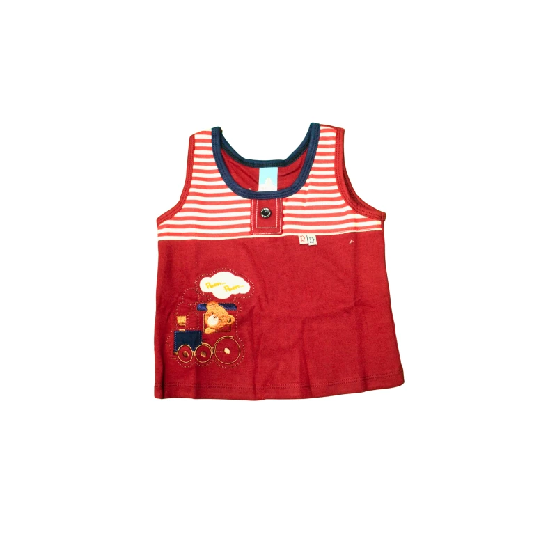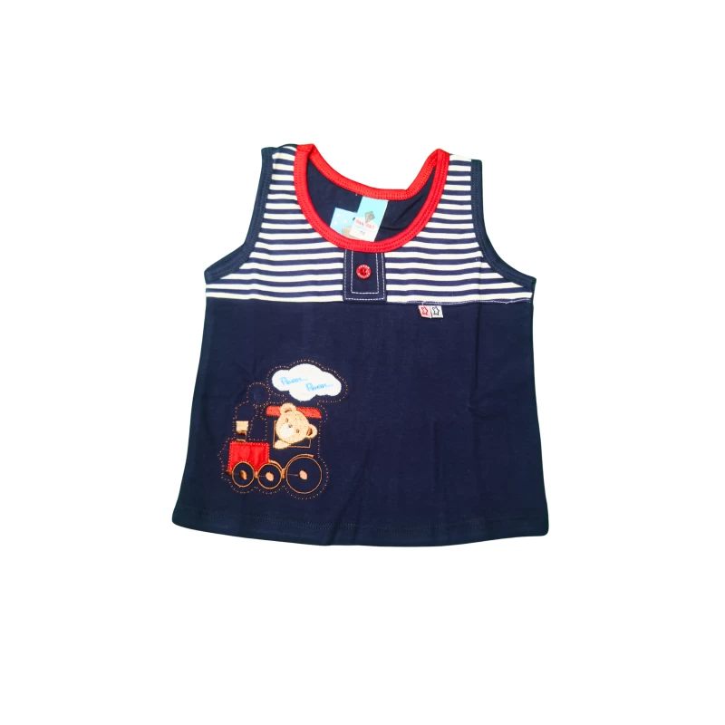 • A sleeveless tank top with a navy body, contrasting striped yoke, and a playful train graphic on the lower front.