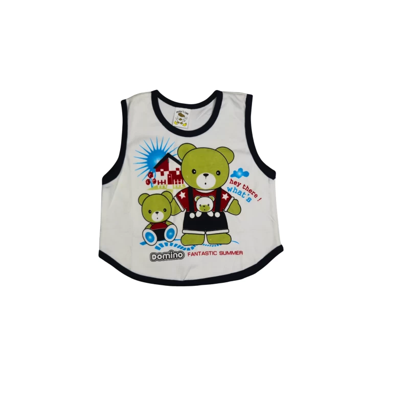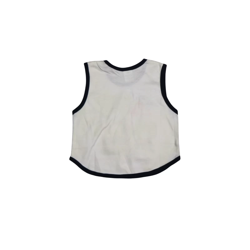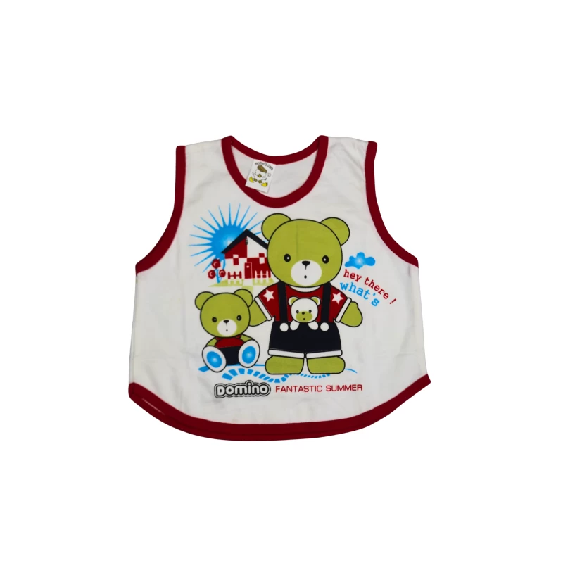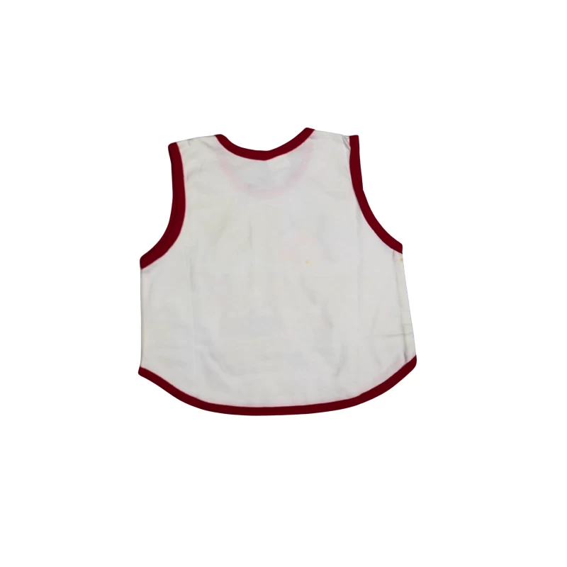 • A sleeveless tank top with a white body, red trim, and a cute teddy bear graphic.
