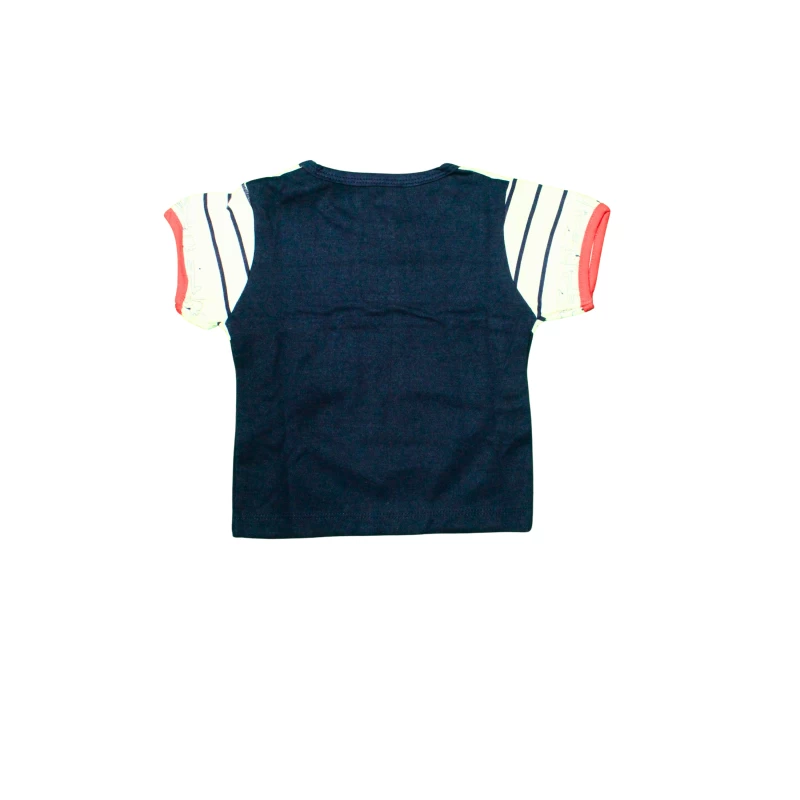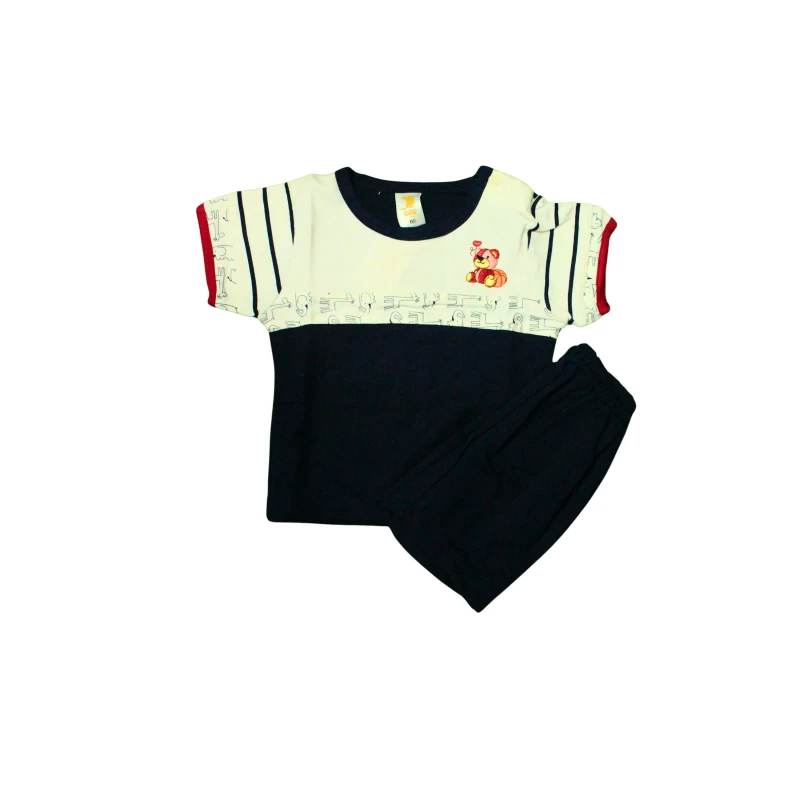 • Comfort-first two-piece outfit for kids. The top features a beige/cream upper with print accents, a dark navy neckline, and a cute teddy bear graphic on the chest. Paired with classic navy shorts for a coordinated look.