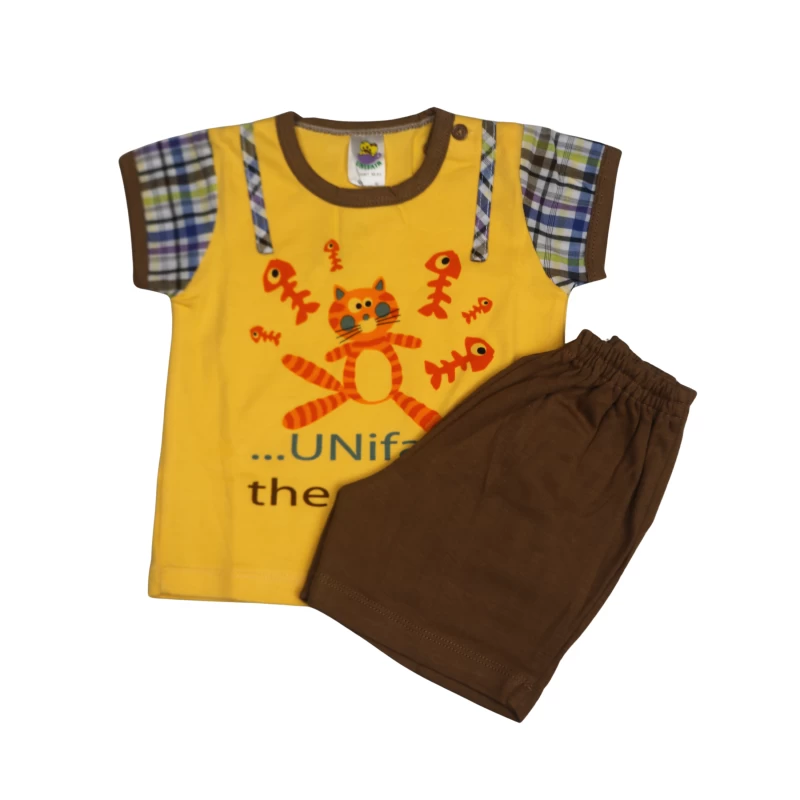Brighten up your child’s wardrobe with this adorable yellow baby t-shirt featuring a playful cat and fish bone print with the fun message “UNifair… the cat’s…”. Designed with soft, breathable cotton fabric and stylish plaid shoulder panels, it’s perfect for everyday wear. Comfortable, lightweight, and ideal for babies and toddlers.