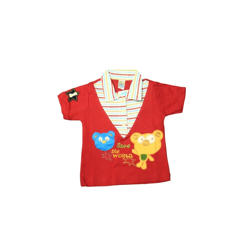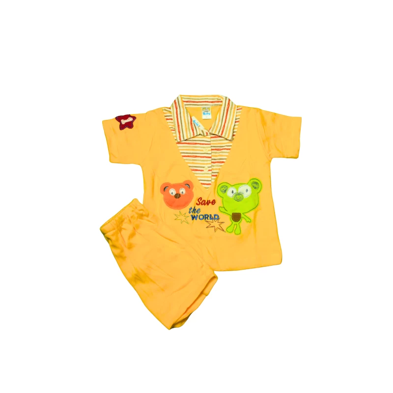 Dress your little one in style with this adorable yellow baby t-shirt and shorts set. Featuring a colorful striped collar, cute bear cartoon prints, and the cheerful message “Save the World,” this set is perfect for daily wear or casual outings. Made from soft, breathable fabric to keep your child comfortable all day. Ideal for babies and toddlers.