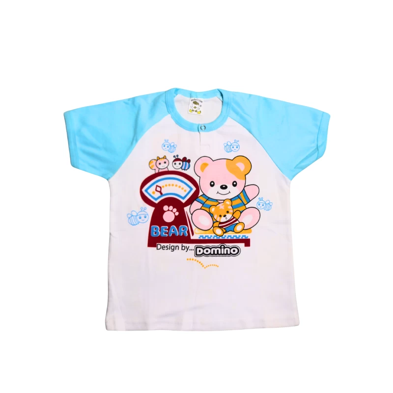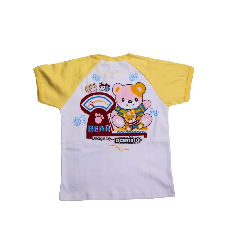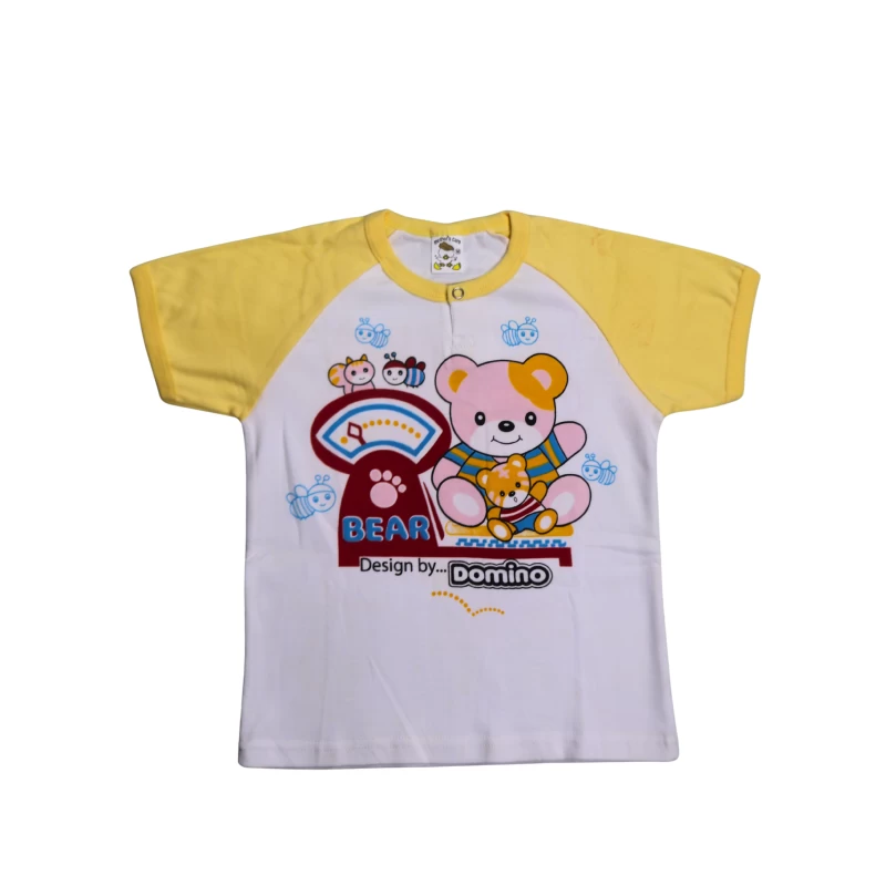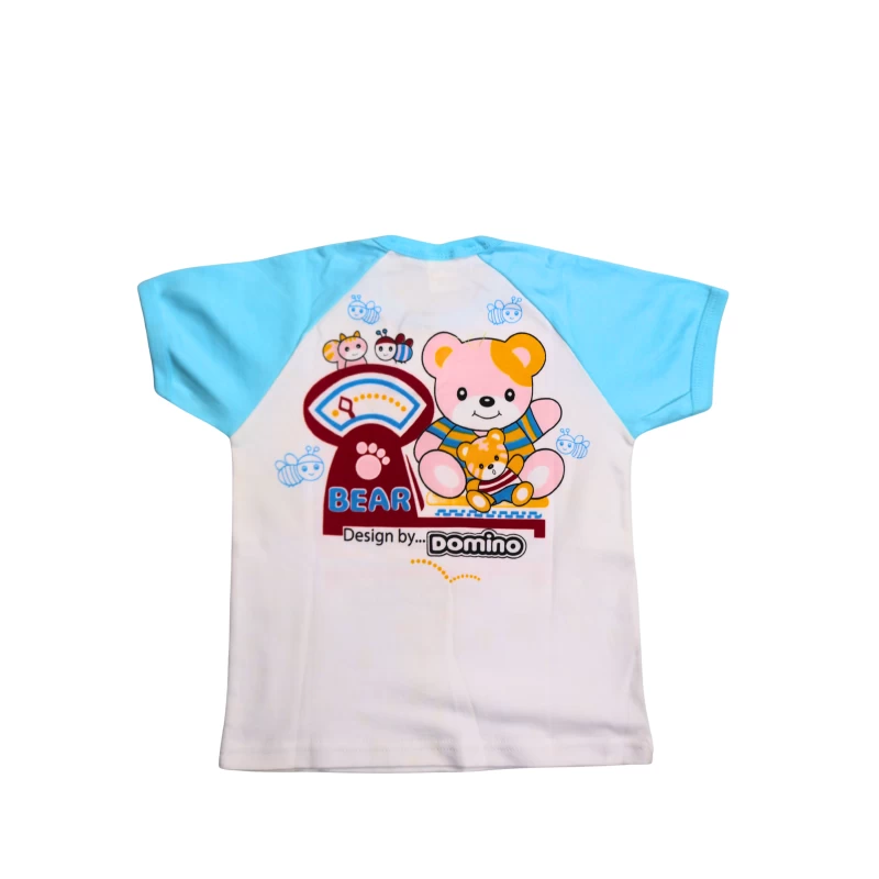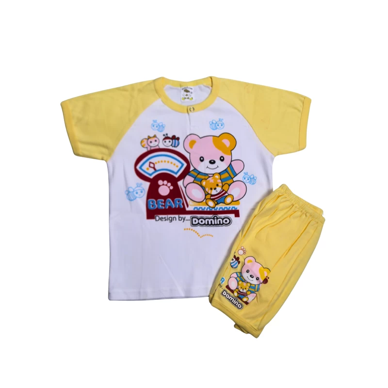 Bright and playful kids’ pajama set featuring a cheerful teddy bear design by Domino. The short-sleeve top is white with sky-blue sleeves and collar, showcasing a lovable bear illustration with colorful accents, plus cute bee and butterfly motifs. The matching sky-blue shorts complete the look with a fun bear graphic on the leg. Made from soft, breathable fabric for comfortable bedtime wear. Perfect for everyday lounging, lazy weekends, or sleepovers. Available in kid-friendly sizes. Design by Domino.