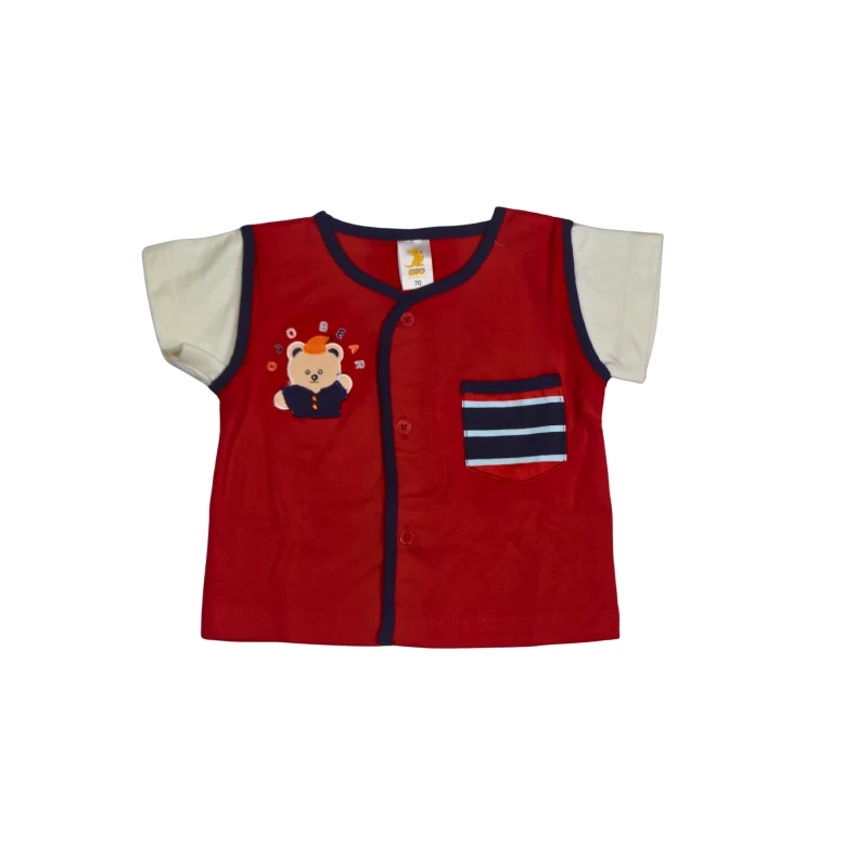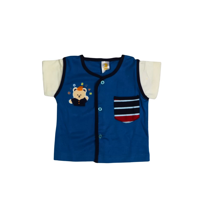 • A short-sleeve top in a rich navy blue with cream sleeves and a cute bear graphic.