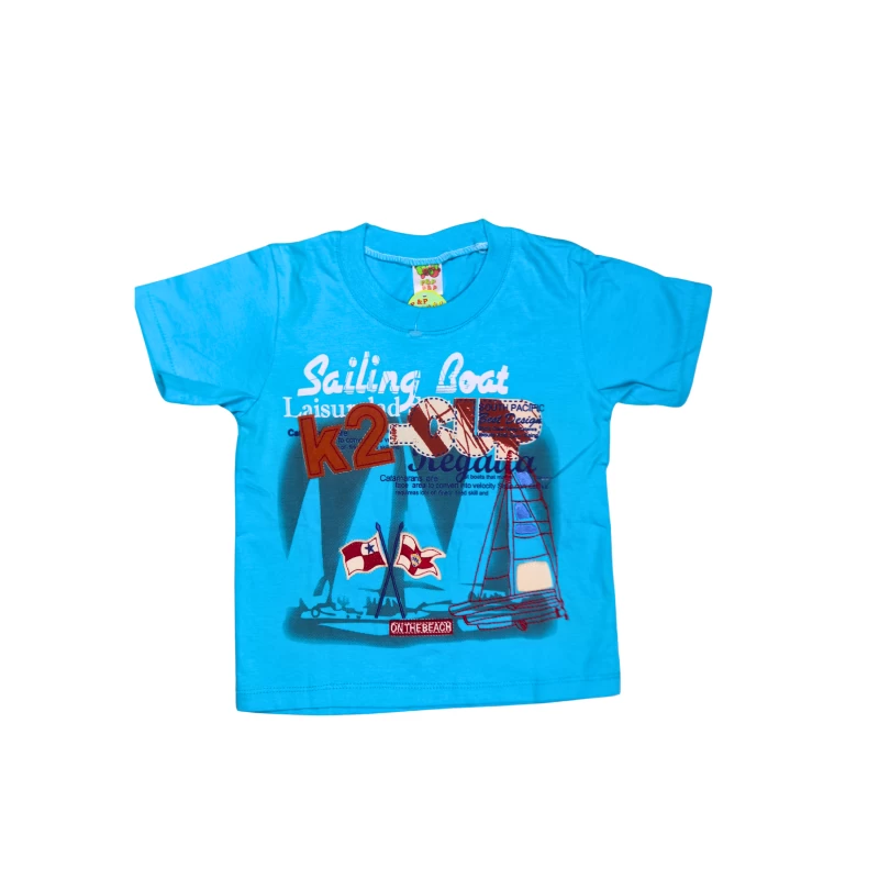 Vivid blue two-piece outfit designed for sunny days and active play. The short-sleeve graphic T-shirt features a fun sailing boat and nautical motifs, paired with comfortable elastic-waist shorts. Made from soft, breathable fabric for all-day comfort and easy care.