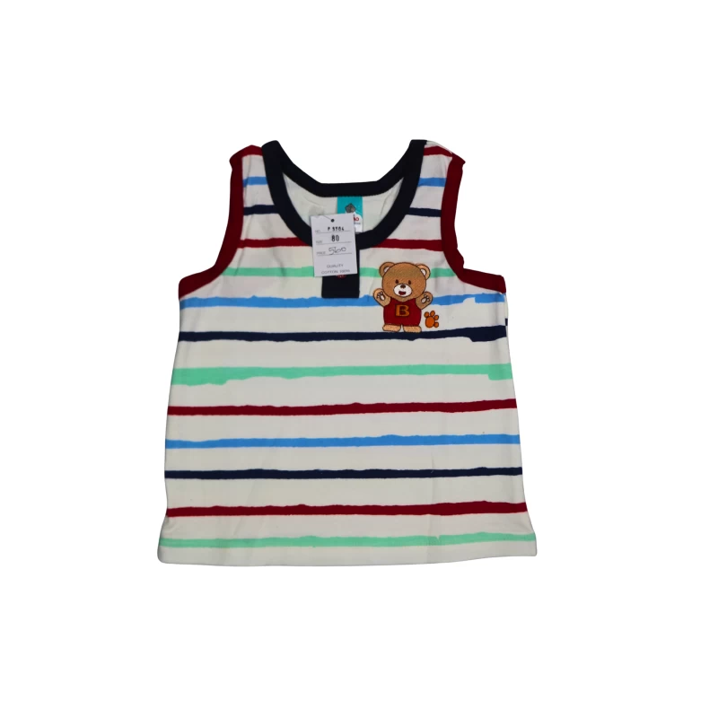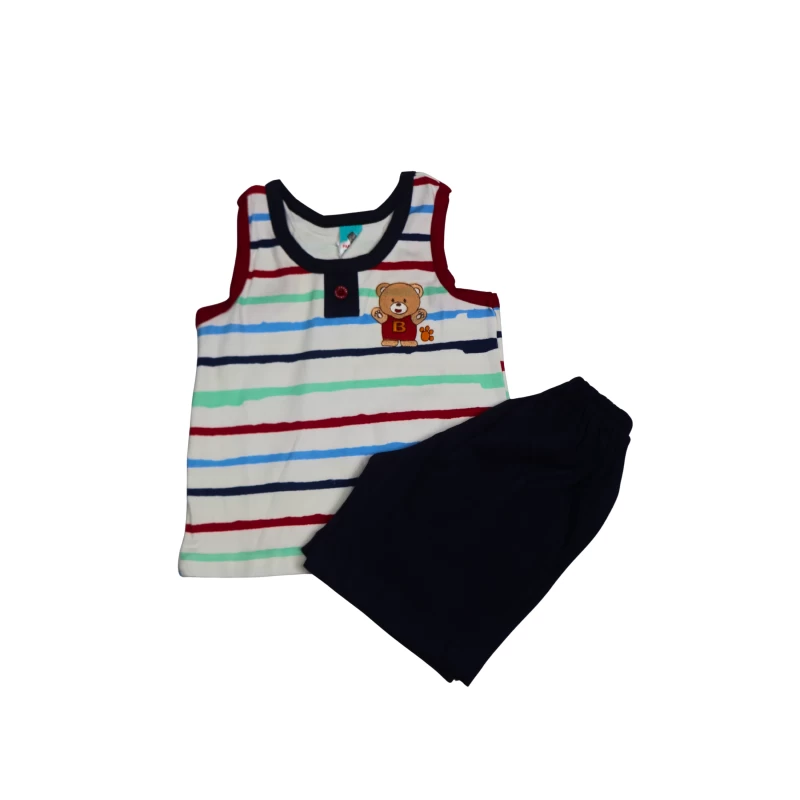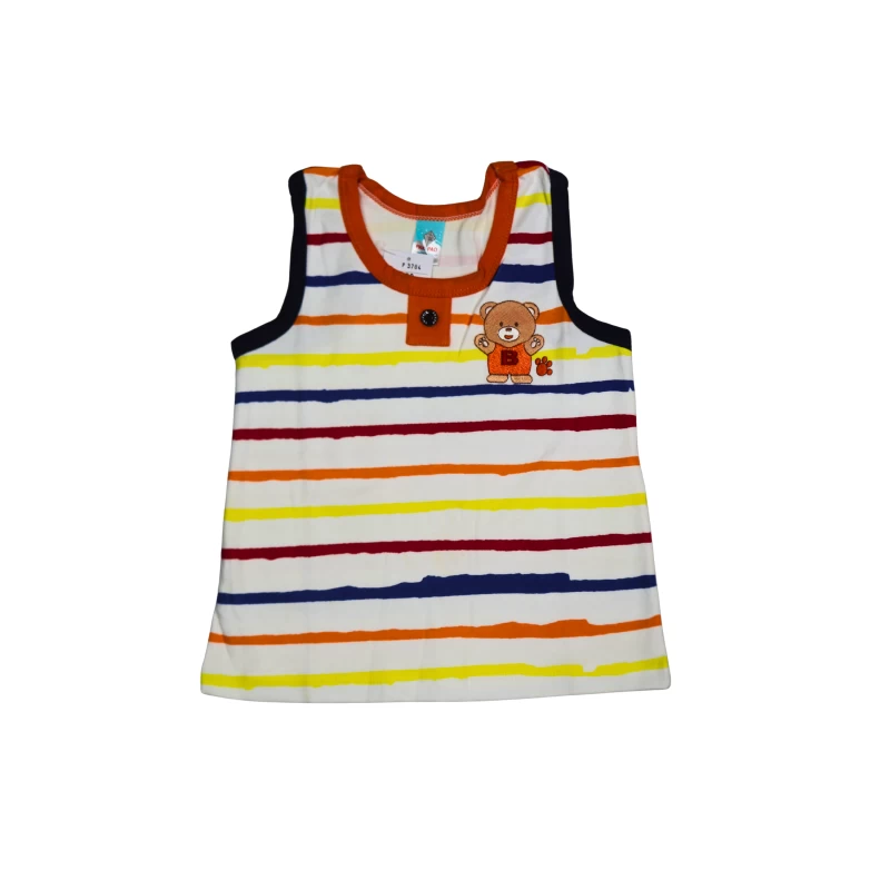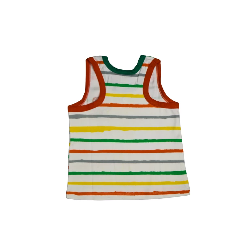 Bright and playful striped sleeveless top paired with vibrant orange shorts. The top features bold horizontal stripes in multiple colors, a contrasting orange neckline, and cute bear embroidery for added charm. Elastic waistband on the shorts ensures a comfy, easy fit for active kids. Made from soft, breathable fabric, this set is perfect for summer play, outdoor adventures, and casual outings. Available in multiple kids’ sizes. Easy to care for—machine washable.