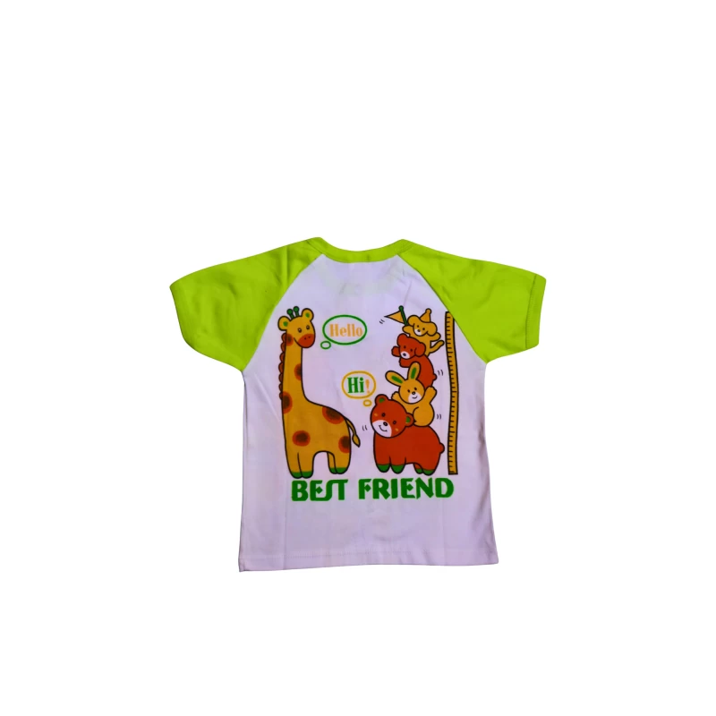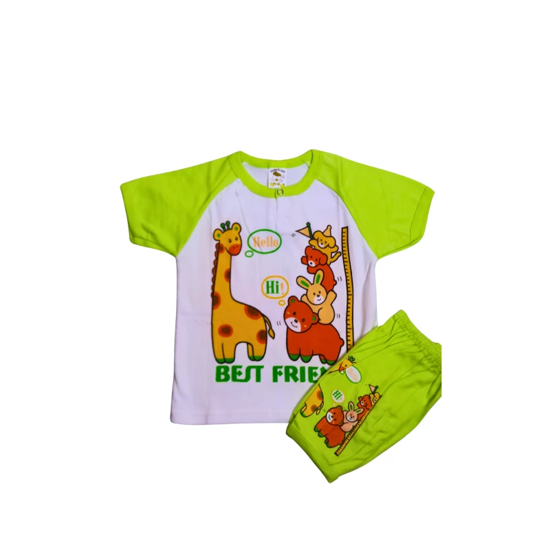 Cheerful two-piece pajama set for kids featuring a bright yellow short-sleeve tee and matching shorts. The front of the tee showcases a playful jungle scene with a giraffe and friendly animal friends, plus fun speech bubbles like “Hello” and “Hi.” The breathable fabric and comfy elastic waistband on the shorts make this set perfect for bedtime, lounging, or warm-weather nights. Vibrant print designed to spark imagination and joy. Available in multiple kids’ sizes.