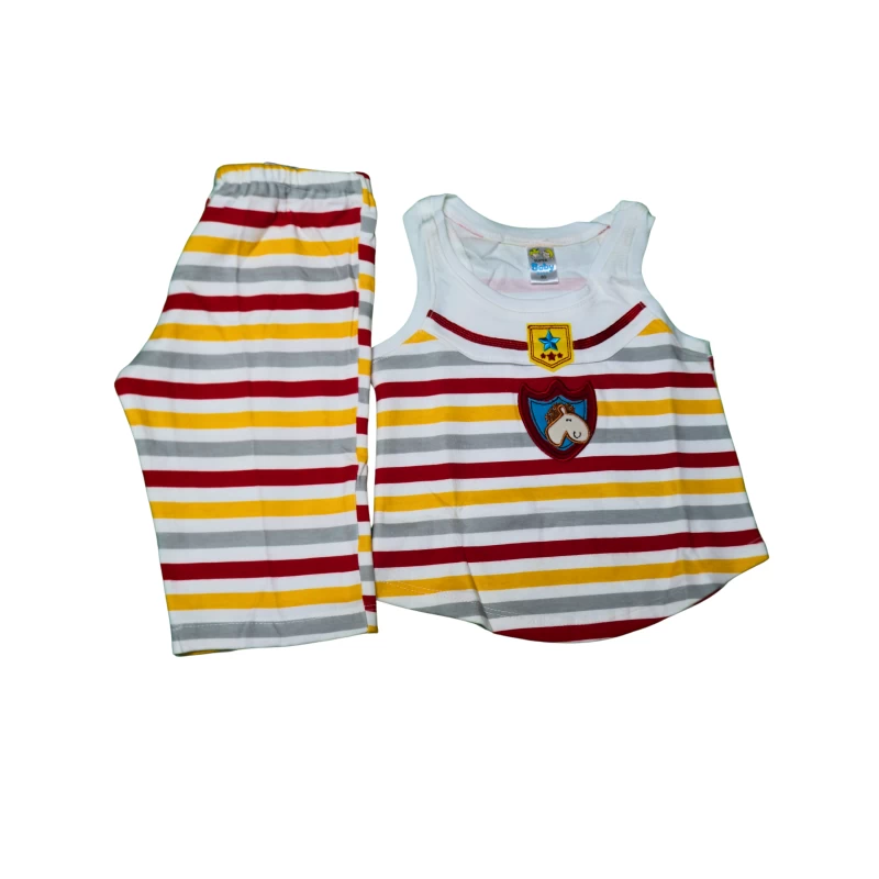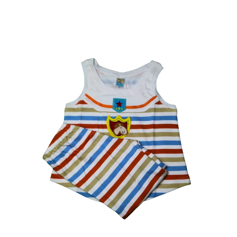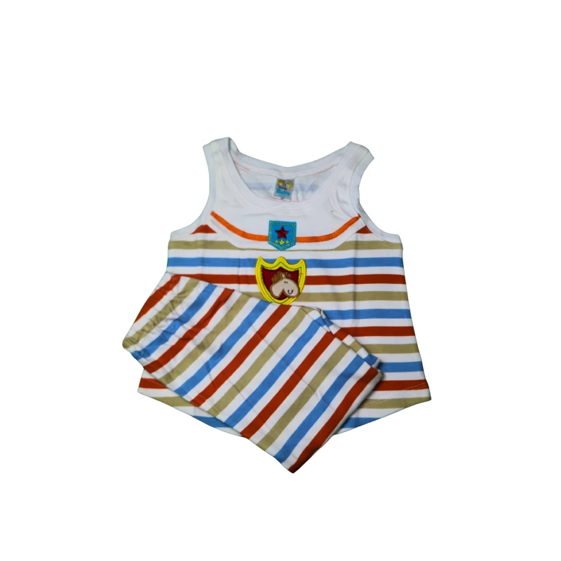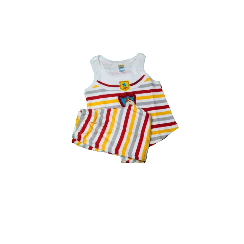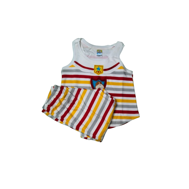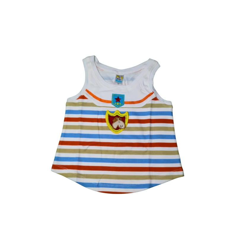 • Fun and breezy sleeveless tank top in bright stripes of red, blue, beige, and white. The front features a playful shield crest and star badge for a sporty look that’s perfect for summer outings, playtime, and casual days. Lightweight and breathable fabric makes this top comfortable for all-day wear, easily paired with shorts, skirts, or leggings.