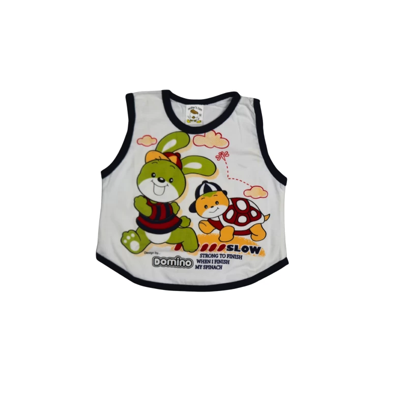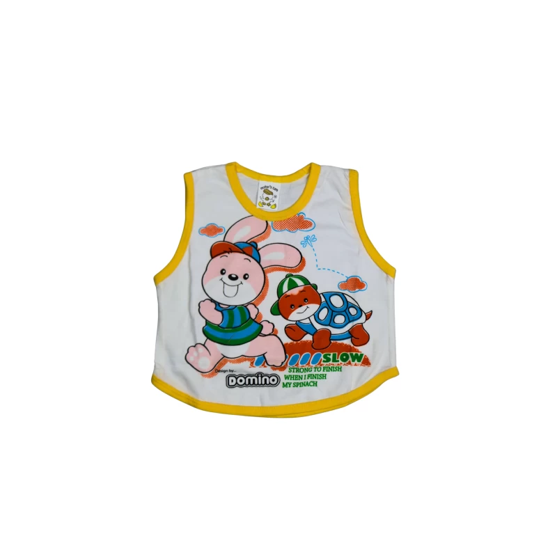 • A sleeveless tank top with white body, orange trim, and a playful bunny graphic.