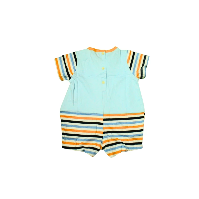 Bright and adorable romper for sunny days and playful adventures. This light-blue romper features a cute bear print on the chest, navy striped sleeves, and contrasting navy pockets. The muted pastel tones keep it sweet and easy to mix-and-match, while the soft, breathable fabric ensures comfort all day. Perfect for everyday wear, playdates, and family outings.