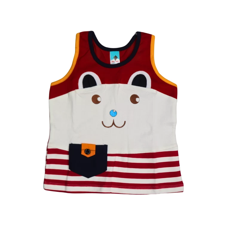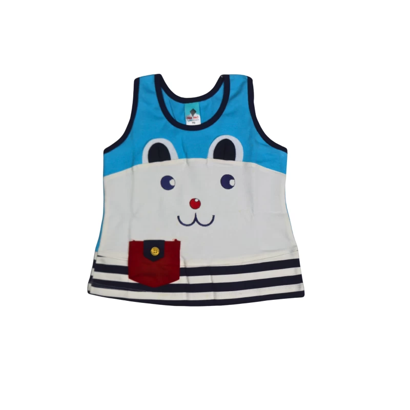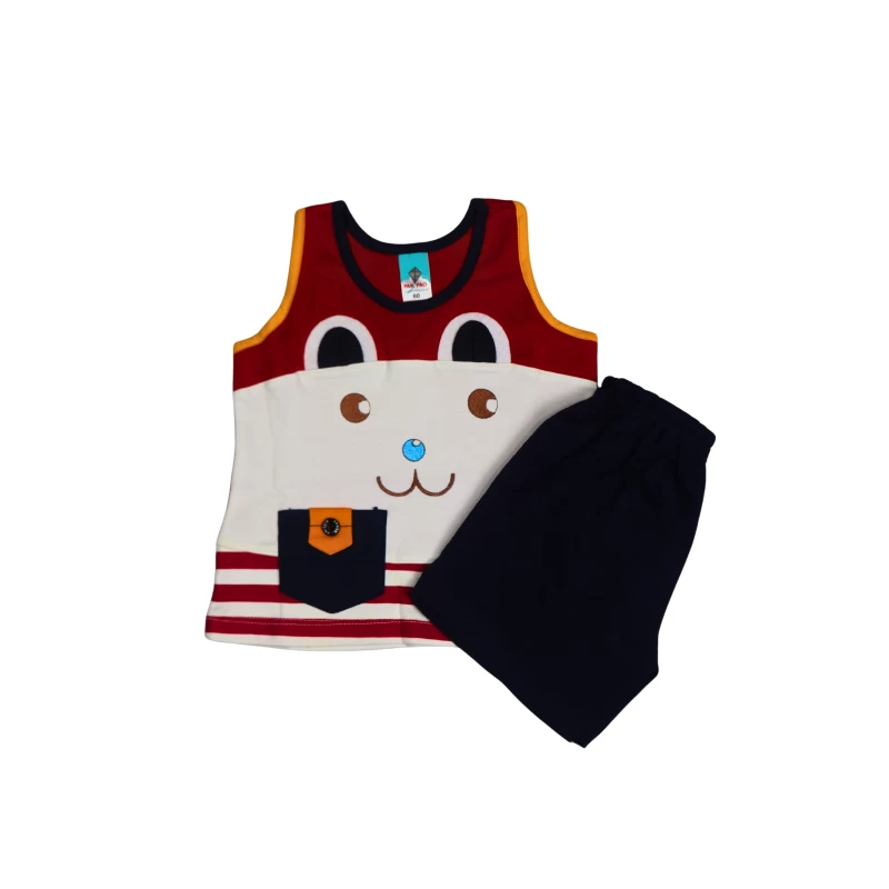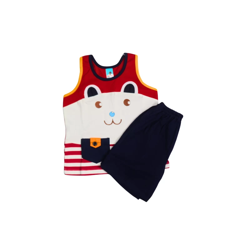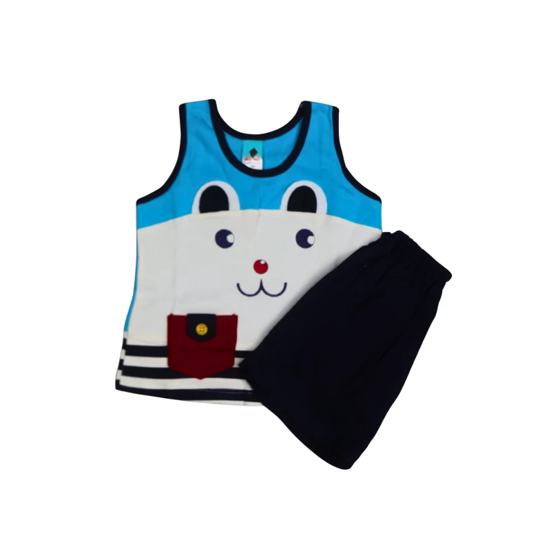 Brighten playtime with this adorable animal-themed sleeveless tank top and navy shorts set. The sleeveless top features a playful blue and white bear face design with a friendly red nose and cute eyes, plus a handy red pocket detail for added charm. The coordinating navy shorts complete the look with comfort-fit elastic waist for easy movement. Made from soft, breathable fabric, this set is perfect for warm days, trips to the park, or casual family outings. Available in multiple sizes for kids aged 1–8 years. Easy care—machine washable.