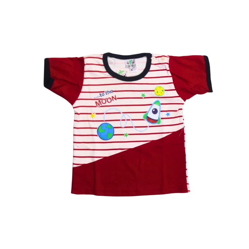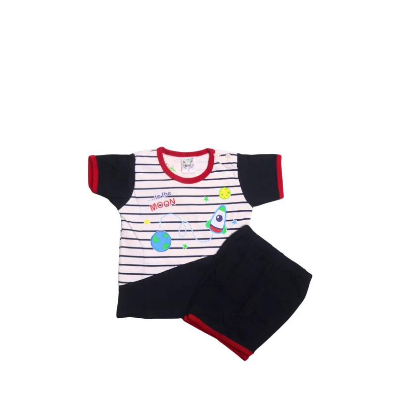 • Design: Space rocket, planets, and stars on a striped tee; solid red shorts