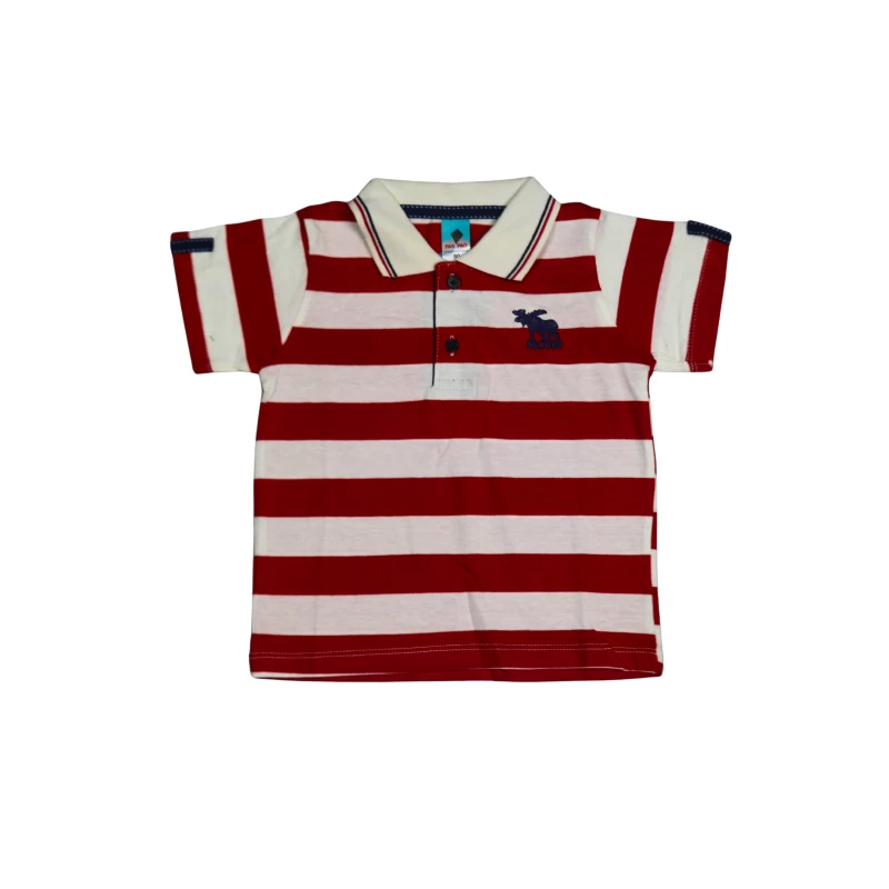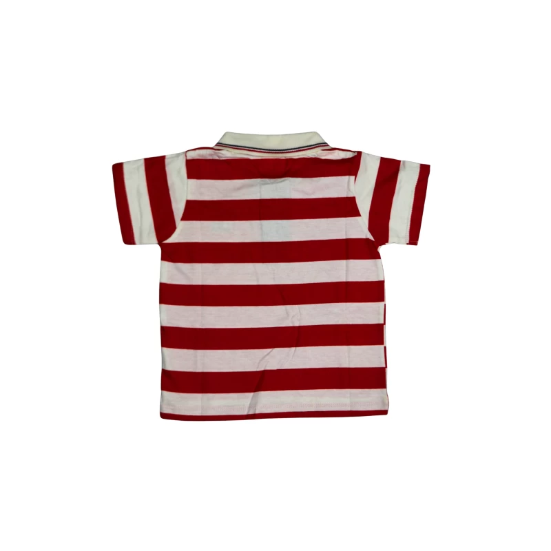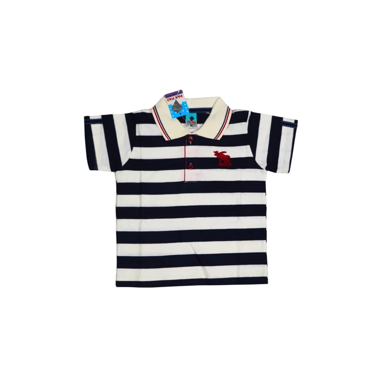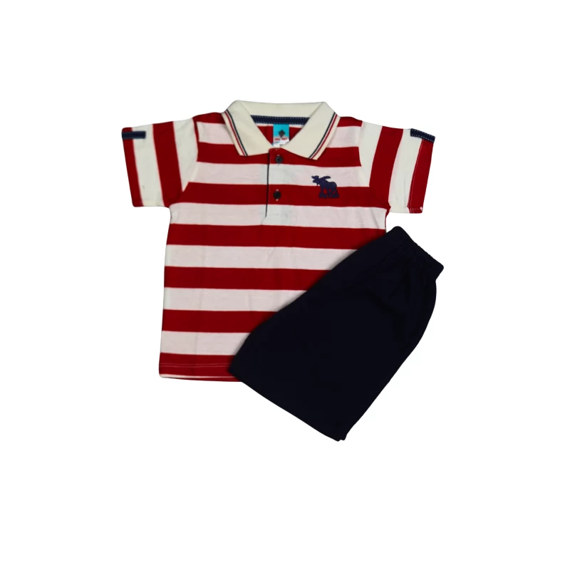Classic and comfortable summer set for active kids. This polo-style short-sleeve shirt features bold navy and white horizontal stripes, a cream collar with red contrast trim, and red buttons for a polished look. The matching navy shorts complete the outfit with an elastic waistband for easy, all-day wear. Made from soft, breathable fabric ideal for play, school, or family outings. Available in multiple sizes to fit kids from 2 to 8 years. Easy care—machine washable.