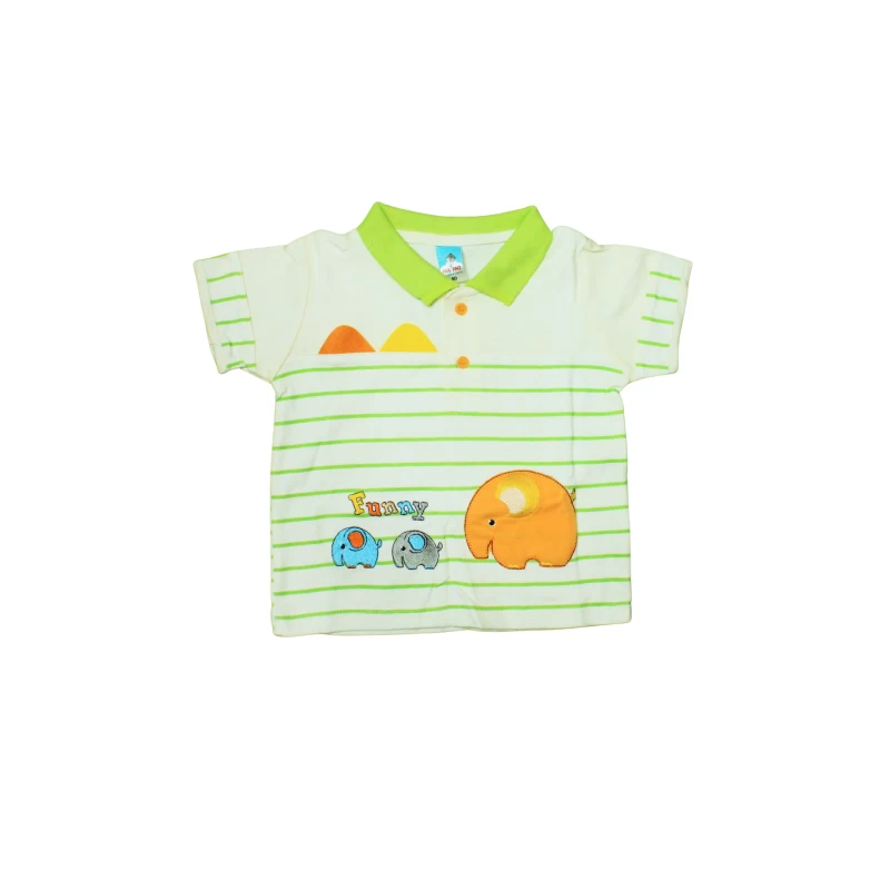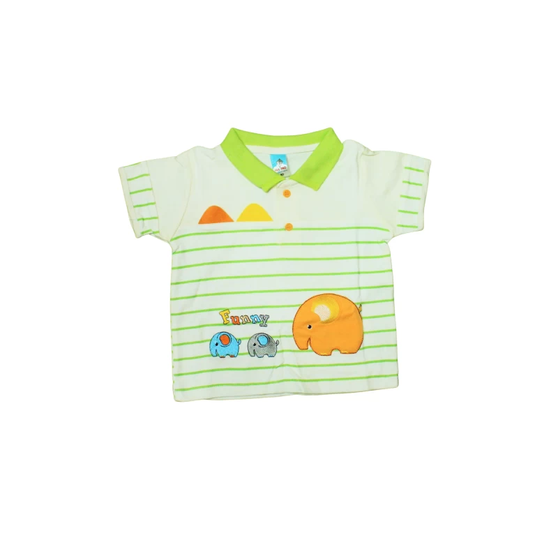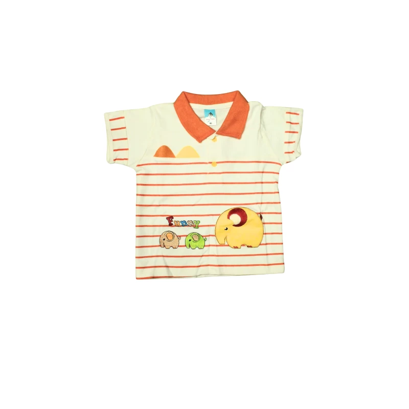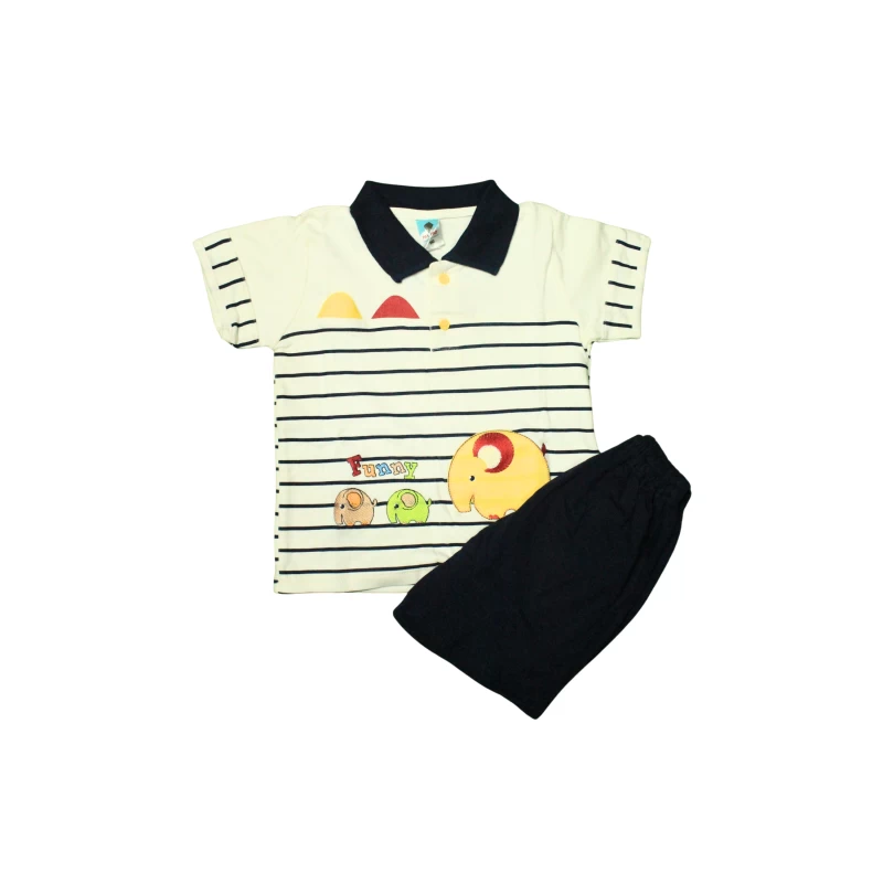 Kids Striped Polo Tee & Shorts Set with Cartoon Elephant/Animal Print