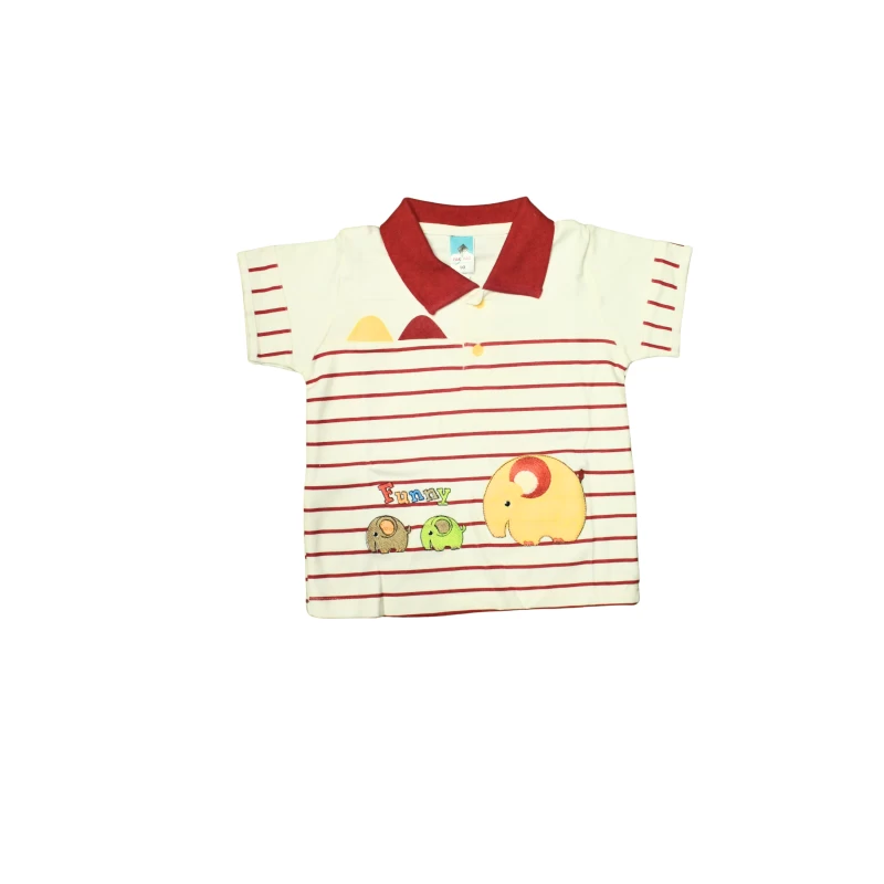 • Cute two-piece outfit for kids featuring a cream polo-style tee with red collar and red stripes, plus matching red shorts. The tee showcases playful animal graphics and colorful accents, making it perfect for daily wear, summer outings, and family events.