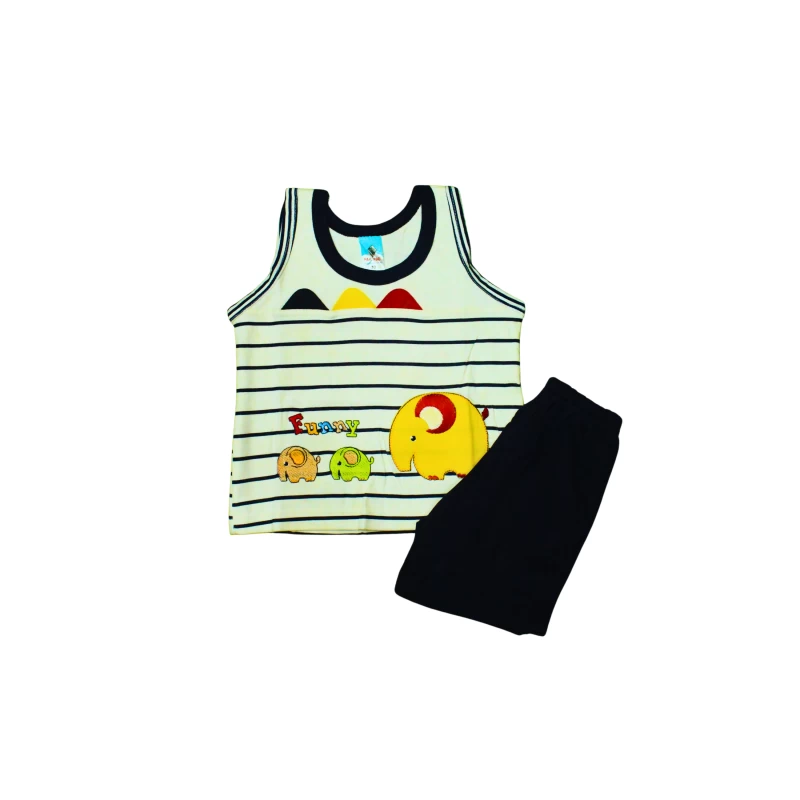 • Fun two-piece outfit for kids featuring a cream tank top with navy stripes, a navy collar trim, and colorful cartoon elephants on the lower front. Paired with comfortable black shorts with an elastic waistband for easy dressing and all-day play.