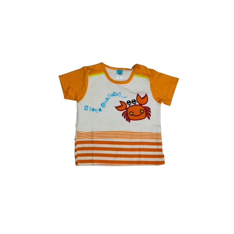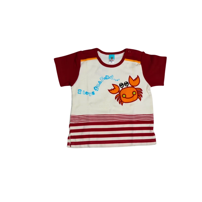 • Bright and playful kids’ set featuring a navy short-sleeve T-shirt and matching navy shorts. The front of the T-shirt showcases a cheerful orange crab graphic with a blue sea-themed phrase, perfect for sunny days at the beach or park. The shirt has navy sleeves with a light body, and the bottom hem features stylish navy and white stripes for a nautical look. Made from comfortable, breathable fabric ideal for active kids.