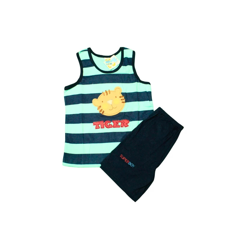 • Dress your little explorer in bright, comfy style with our Navy & Yellow Striped Tiger Graphic Kids Tank Top & Shorts Set. This two-piece outfit features: