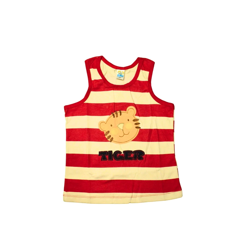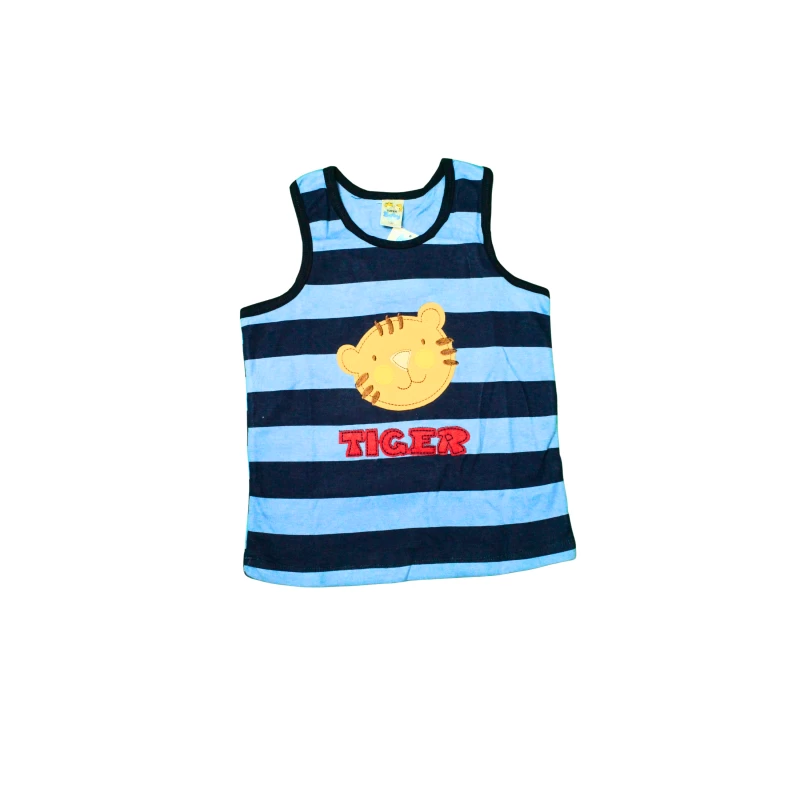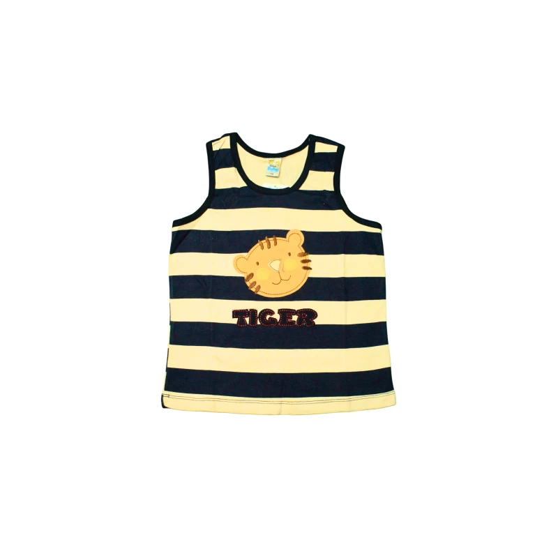 • A sleeveless tank top with bold navy and yellow horizontal stripes, navy trim, and a cheerful tiger graphic on the front.