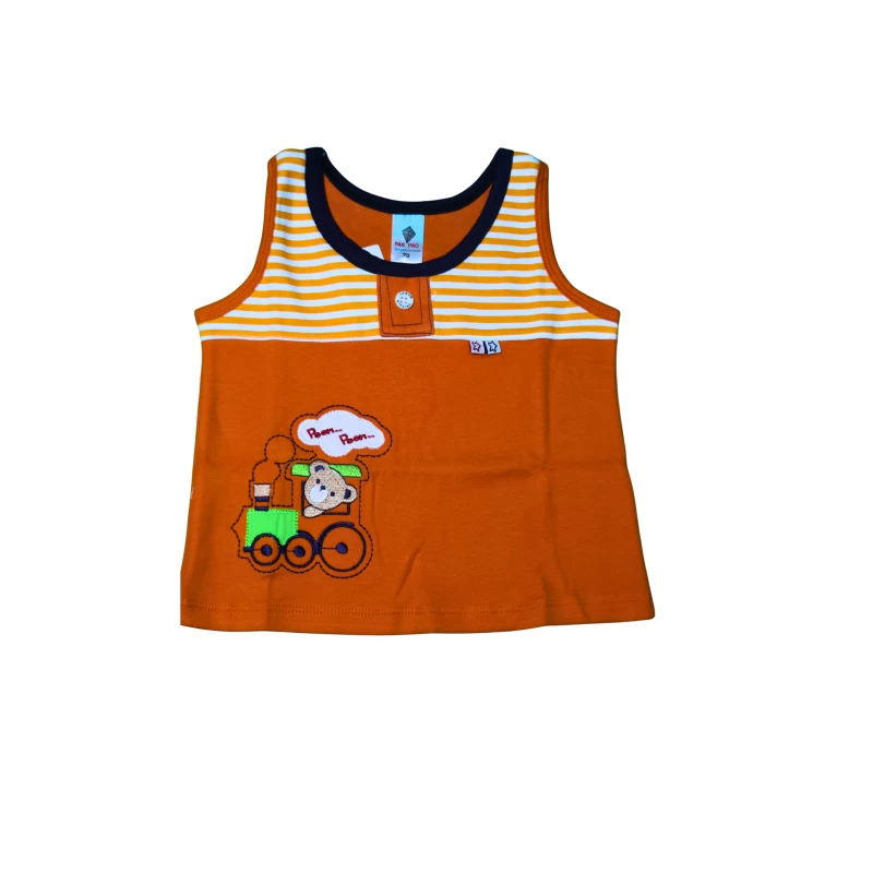 • A sleeveless tank top with a navy body, contrasting striped yoke, and a playful train graphic on the lower front.
