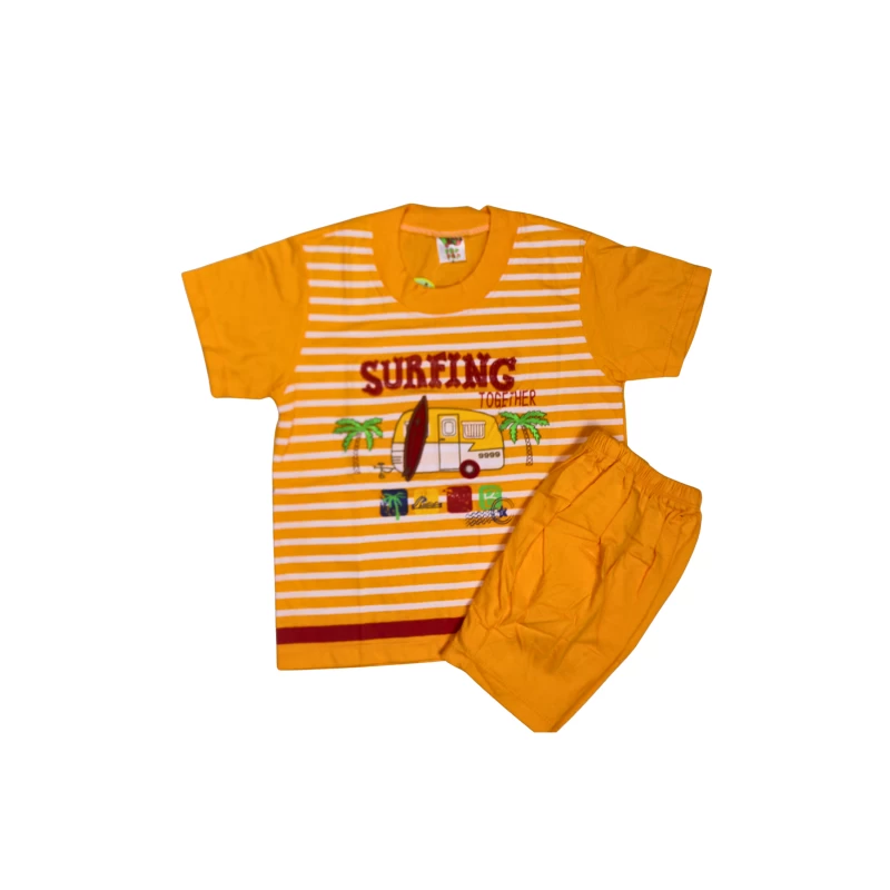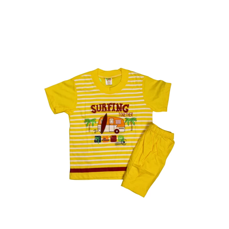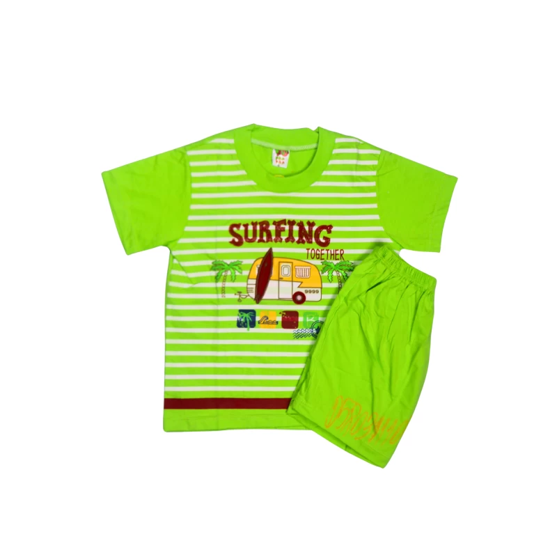 Get your little one ready for sunny days and seaside adventures with our Bright Green Surfing Theme Kids T-Shirt & Shorts Set. This vibrant neon green set features: