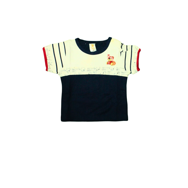 • Comfort-first two-piece outfit for kids. The top features a beige/cream upper with print accents, a dark navy neckline, and a cute teddy bear graphic on the chest. Paired with classic navy shorts for a coordinated look.